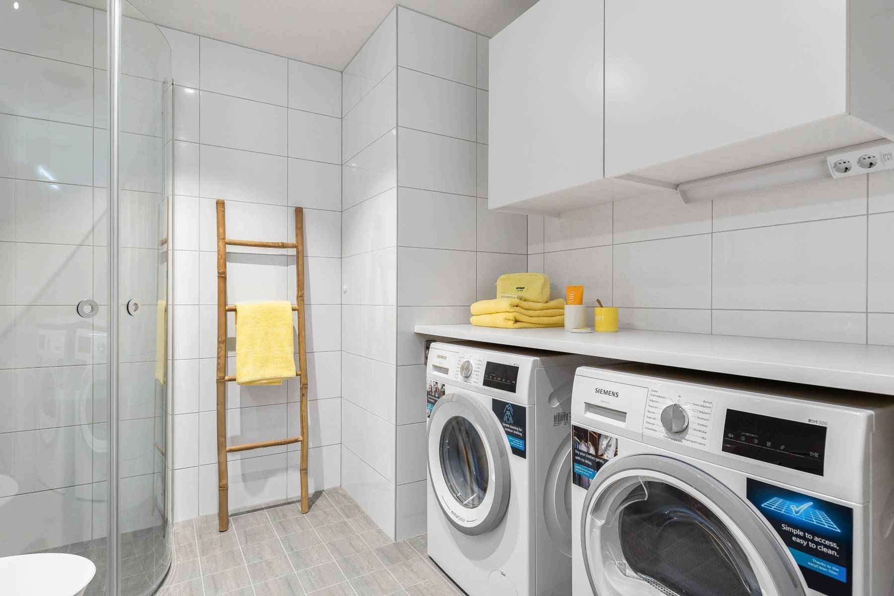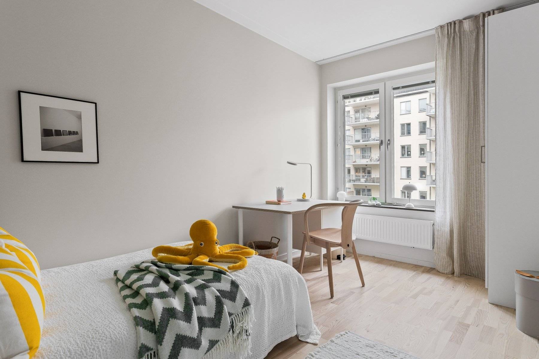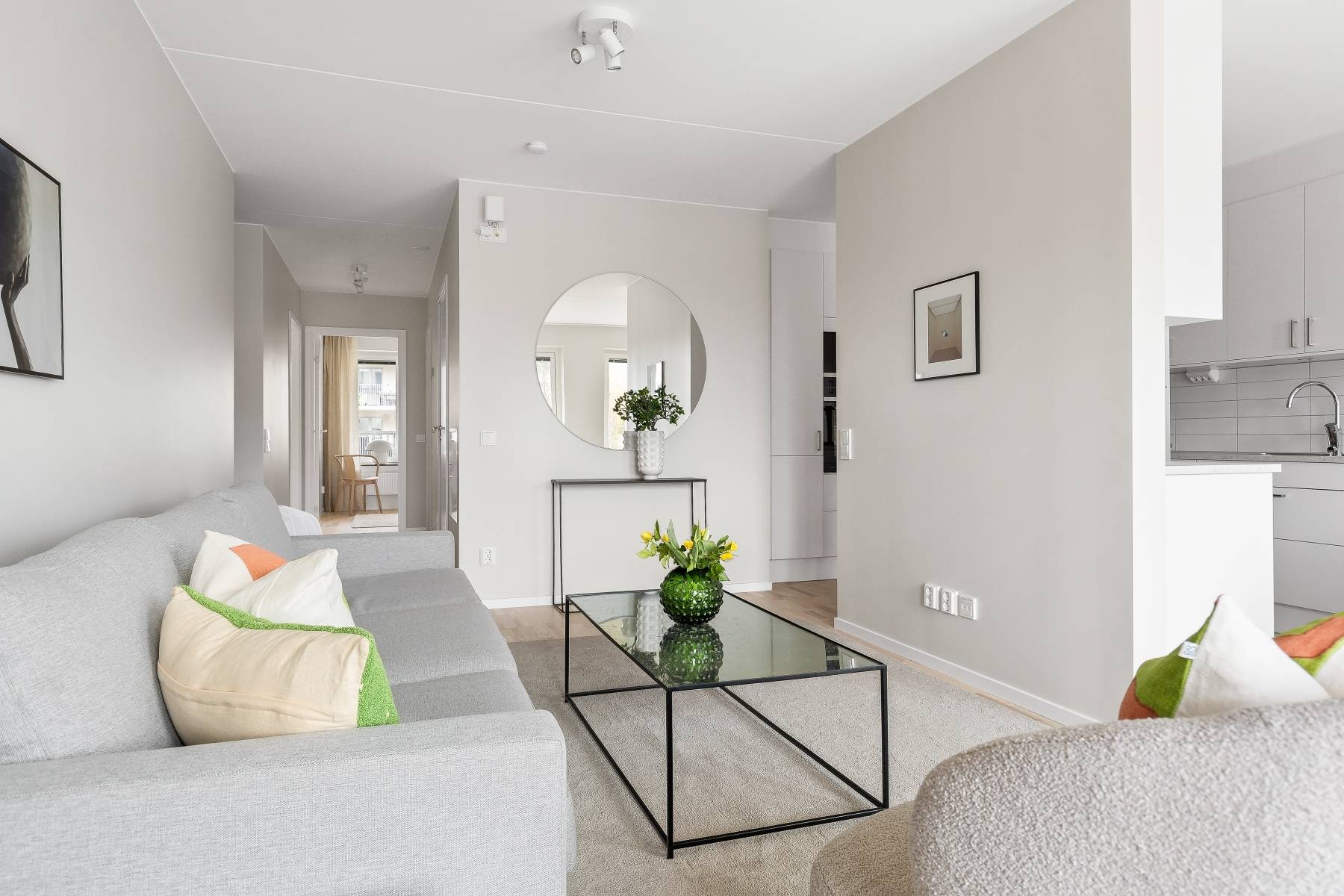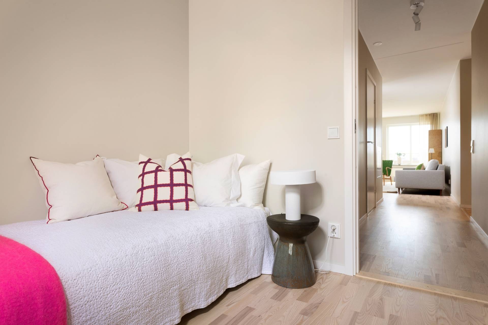 Den här genomgångsfemman högst upp i huset har allt. Rymliga sociala ytor, dubbla badrum, två imponerande terrasser och gott om förvaring. Bostadsrätt med förvaring i förråd och tre klädkammare Välkommen till denna femma högst upp i huset! Kliv in i den trevliga entrén som har plats för avhängning och förvaring av ytterkläder och skor i en skjutdörrsgarderob med städskåp. Dessutom har tre av sovrummen varsin klädkammare. Bostadsrätten har två helkaklade badrum med dusch vilket underlättar livet i familjen. Det större har badkar som tillval och är även utrustat med tvättmaskin och torktumlare. Ovanpå maskinerna finns en praktisk arbetsbänk som gör det lättare att vika tvätten samt väggskåp för extra förvaring. Halvöppet och socialt samt terrass med kvällssol Det gemensamma köket och vardagsrummet ger dig alla möjligheter att ha stora härliga middagar med många gäster, och att låta hela familjen, inklusive kompisar, får ta plats i vardagen. Bardelen i köket blir snabbt familjens favoritplats, perfekt för såväl frukost och läxläsning, som för smårätter och snacks till helgen. Utanför rummet väntar de båda väl tilltagna terrasserna i olika väderstreck. Här kan du inreda med sköna stolar, en matplats, egna odlingar och krukor, och njuta av livet i solen utan att behöva ägna dig åt trädgårdarbete. Sovrum med gott om förvaring Bostadsrättens stora sovrum är luftigt och rofyllt, med en dörr ut till ena terrassen. En perfekt plats att börja sommarmorgnarna med en kopp kaffe. I rummet finns en rymlig klädkammare för skor, kläder och väskor. Två av de andra sovrummen har varsin klädkammare med förrådsutrymme. Det fjärde sovrummet kan du självklart inreda som ett hemmakontor om det passar dig bättre. Här kommer du att trivas! Inredning i din nya bostadsrätt i Ängsklockan Originalsortimentet erbjuder bland annat: Trestavig ekparkett från Kährs Släta vita köksluckor från Marbodal Vitmålade väggar för att skapa en stilren helhet att inreda kring Miljöklassade vitvaror från Siemens Induktionshäll Helkaklade badrum Duschväggar i klarglas från INR Vit kommod och spegelskåp från INR Vill du sätta en personlig prägel på din bostadsrätt så finns även val att göra utanför originalsortimentet. Somliga val är kostnadsfria medan andra tillför en extra kostnad. Vi hjälper dig gärna på vägen.7 images