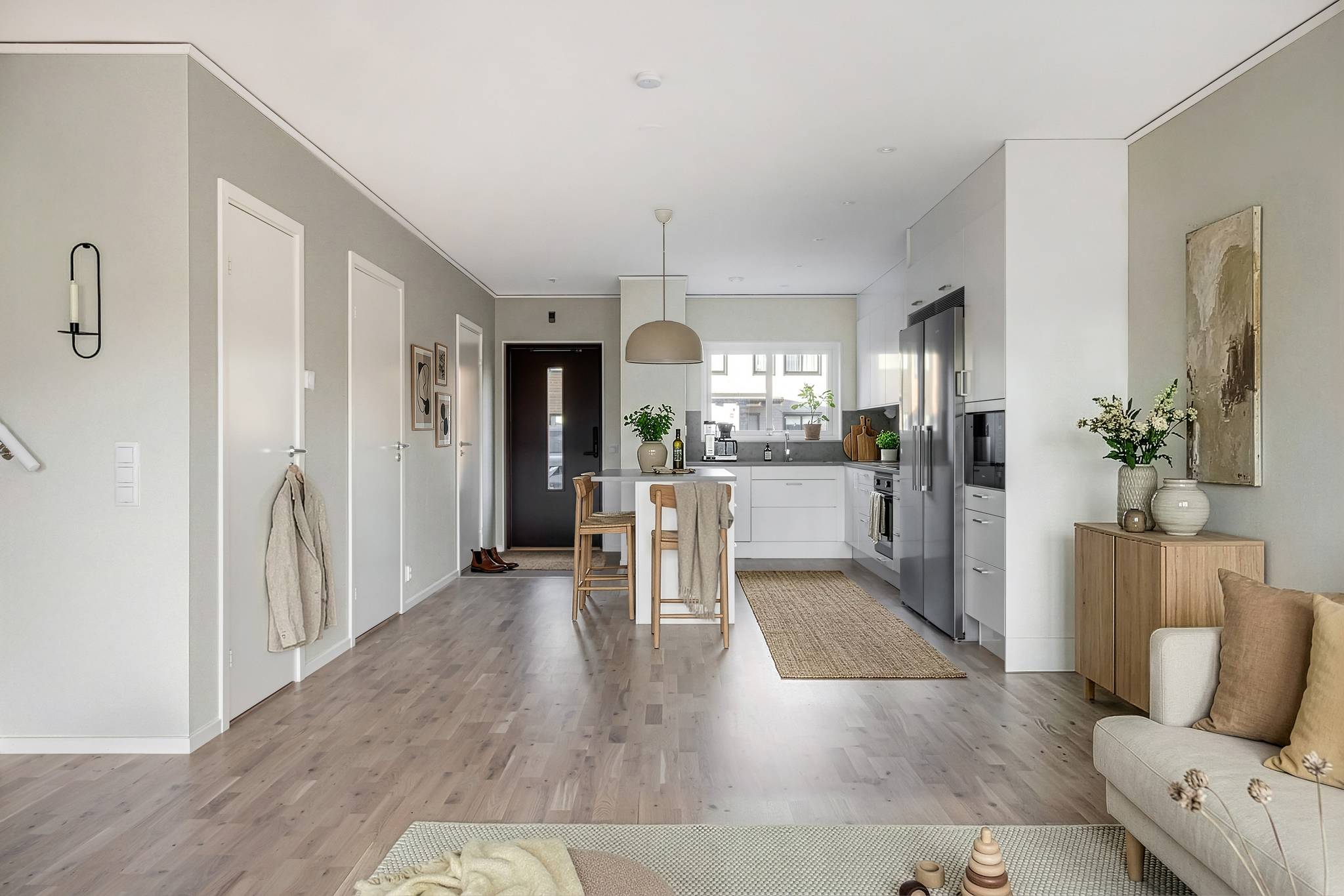 Prissänkt 250 000 kr och inflyttningsgklart! Välkommen till ett svanenmärkt radhus med genomtänkta ytor och stilren inredning. Vid entrén finns plats för två bilar och ett förråd nära till hands. Hallen är rymlig och leder vidare till en separat tvättstuga och ett ljust badrum med dusch, wc och kommod. Köket är öppet och socialt med bra arbetsytor och en köksö. Det ligger i direkt anslutning till vardagsrummet som har utgång till en trädäckad altan och en egen liten gräsmatta, perfekt för både avkoppling och umgänge. En trappa tar dig upp till det övre planet där ett ljust allrum, tre sovrum och gott om förvaring väntar. Det största sovrummet har en stor klädkammare med fönster. Här finns också ett andra badrum, utrustat med badkar, wc och kommod. Kök och badrum kommer från Marbodal och är inredda i stilen Kalk. Här blandas kalkstenstoner och vitt på ett sätt som känns lika inbjudande som tidlöst, perfekt som bas oavsett om du trivs bäst med en klassisk eller modern stil. Välkommen på visning! OBS! Bilderna är digitalt stylade!16 images
