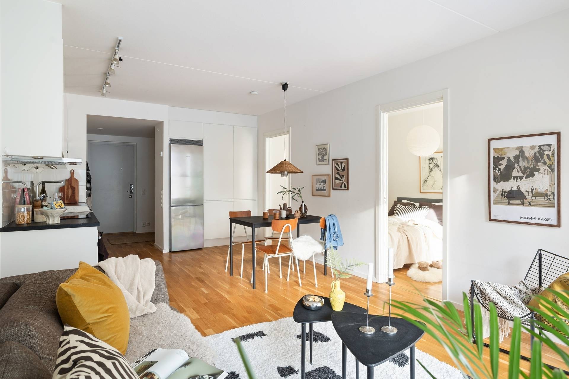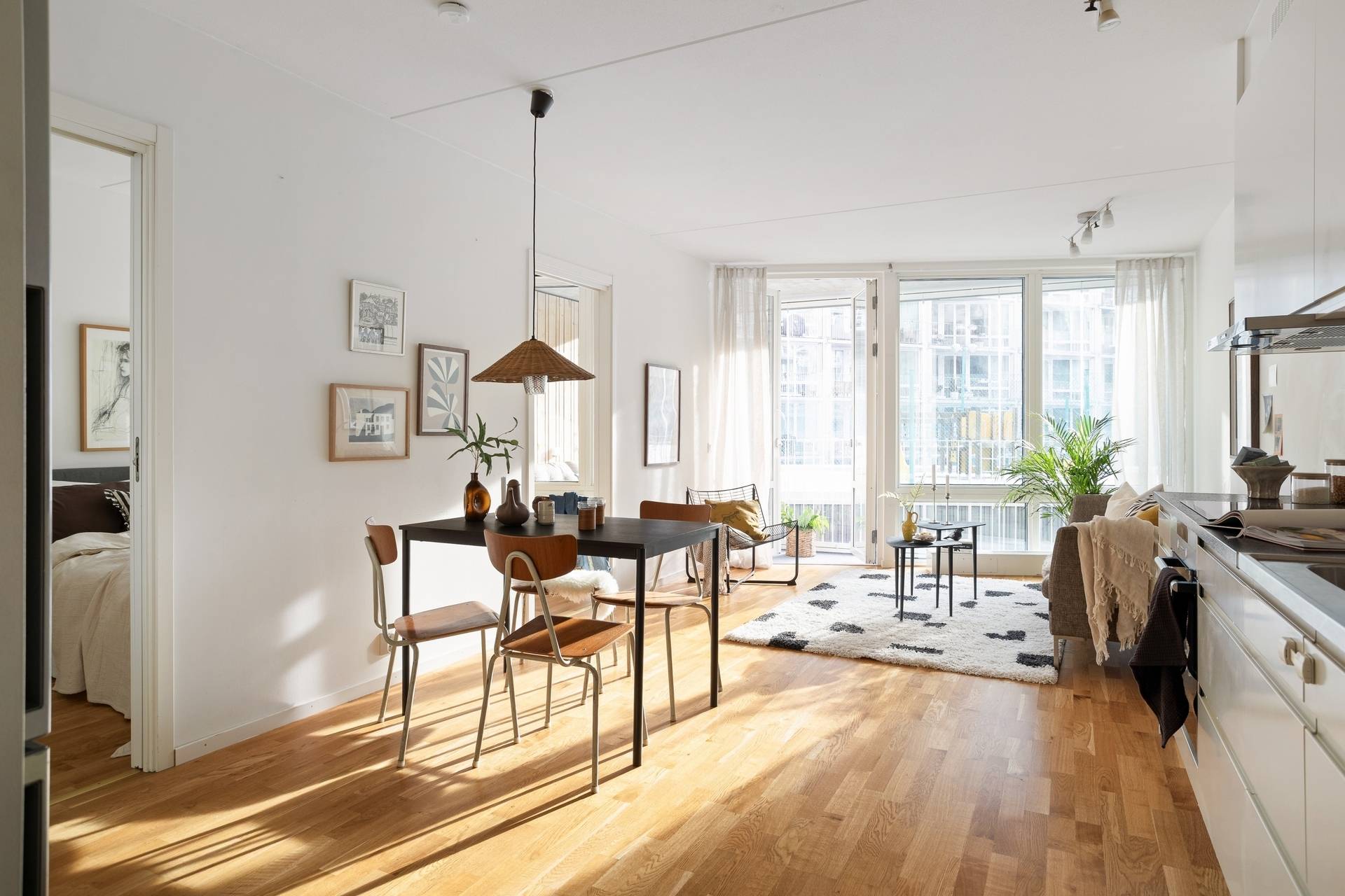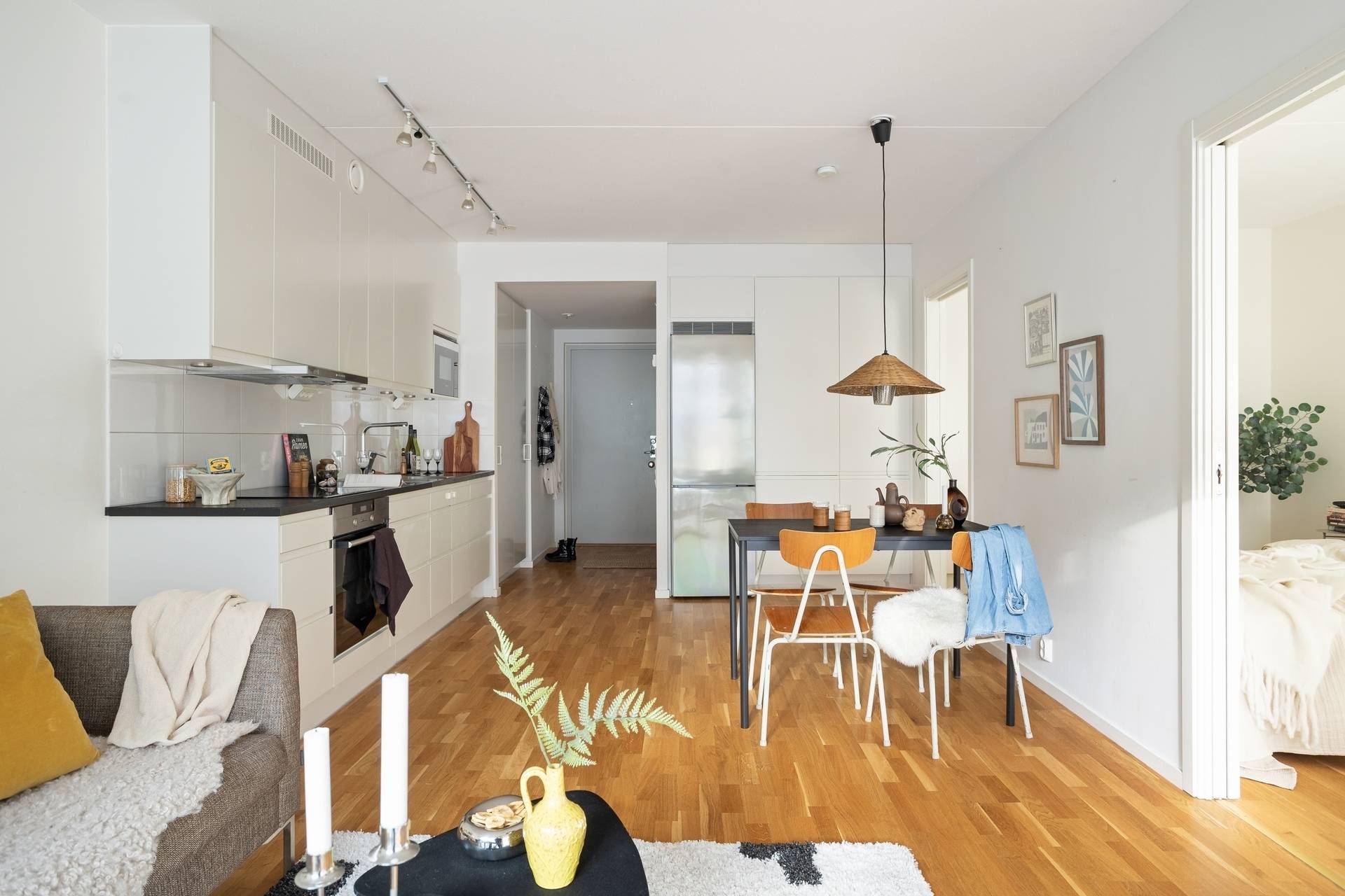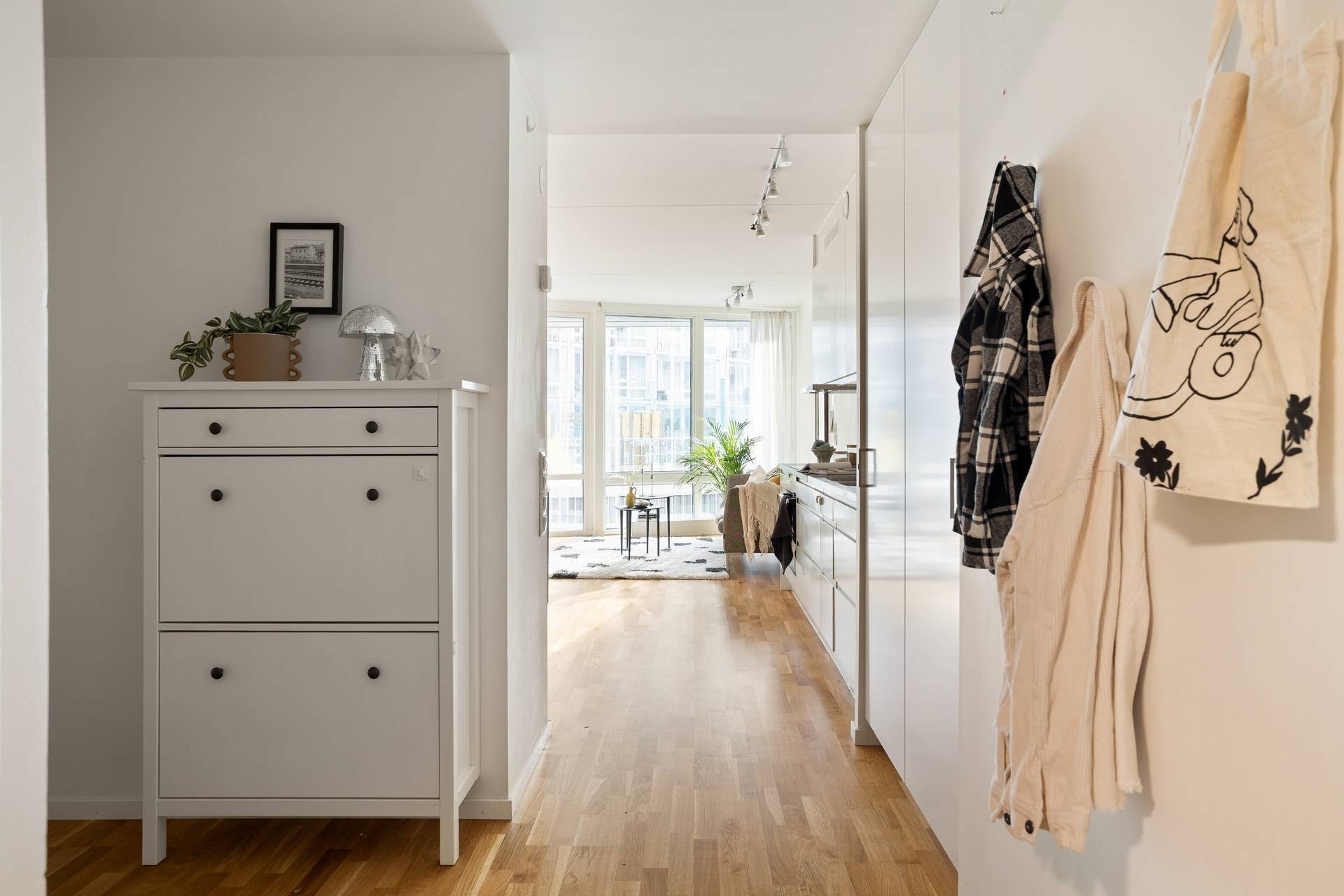 Redan vid första steget in möts du av ett imponerande ljusflöde från de stora fönsterpartierna som sträcker sig från golv till tak. Tillsammans med den öppna planlösningen skapas en luftig och inbjudande atmosfär där vardagsrum och kök samspelar i en social och trivsam helhet. De dubbla glasdörrarna leder ut till den generösa balkongen – en självklar förlängning av bostaden under årets varmare månader. Planlösningen är både genomtänkt och flexibel med goda förvaringsmöjligheter, egen tvättdel i badrummet samt ett rymligt sovrum som med enkla medel kan delas av för att skapa ytterligare ett rum – perfekt som arbetsrum, barnrum eller walk-in-closet. Här bor du med ett centralt och bekvämt läge, där vardagen blir enkel med tunnelbanan och bussar runt hörnet, Lindhagens galleria med ICA Maxi, systembolag och service i närheten samt badbryggor och Mälarens strandpromenad bara en kort promenad bort. Föreningen är stabil och klimatsmart, äger marken och erbjuder garageplatser i källarplan som nås smidigt med hiss. Till bostaden hör även ett separat förråd. Välkommen hem!53 images