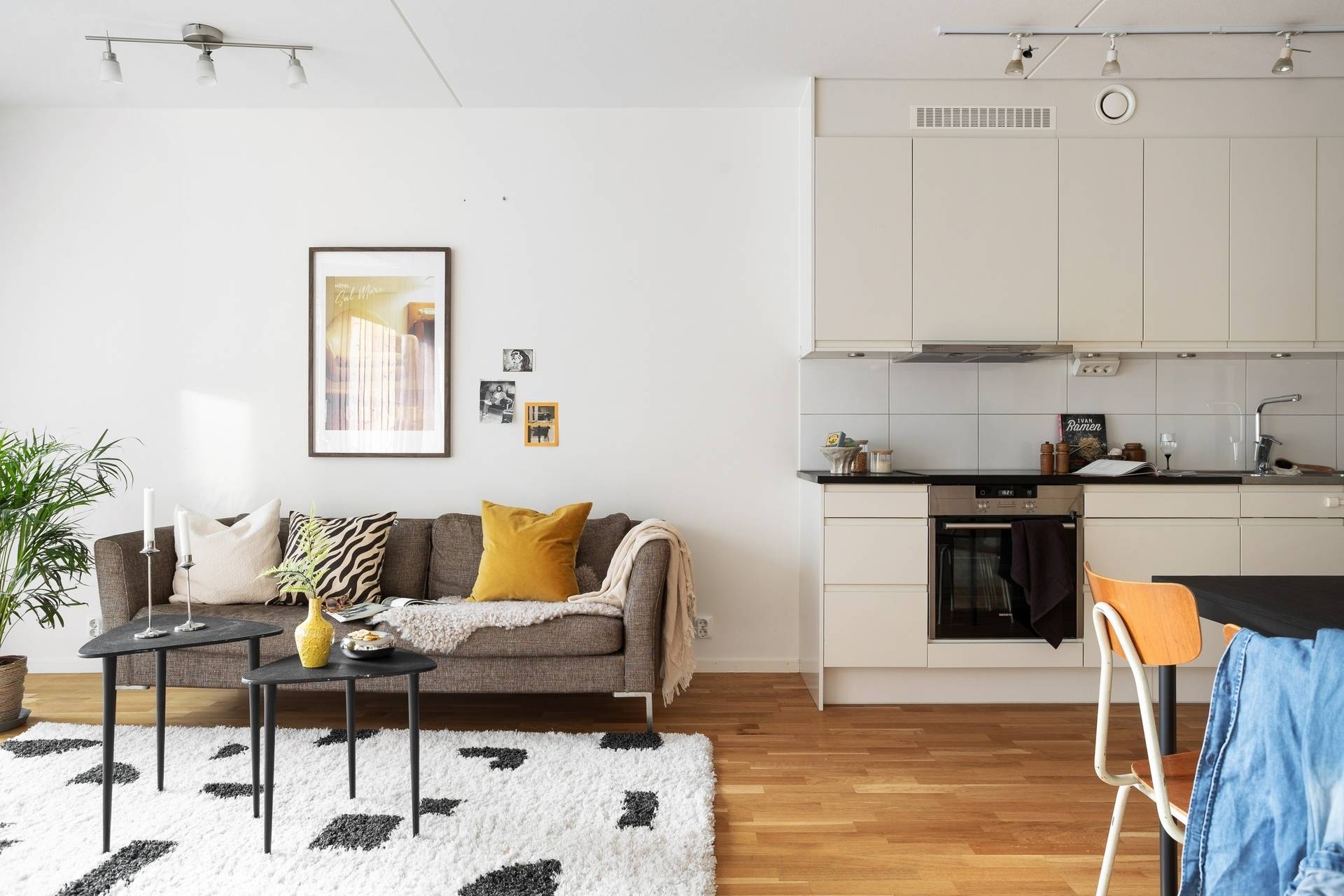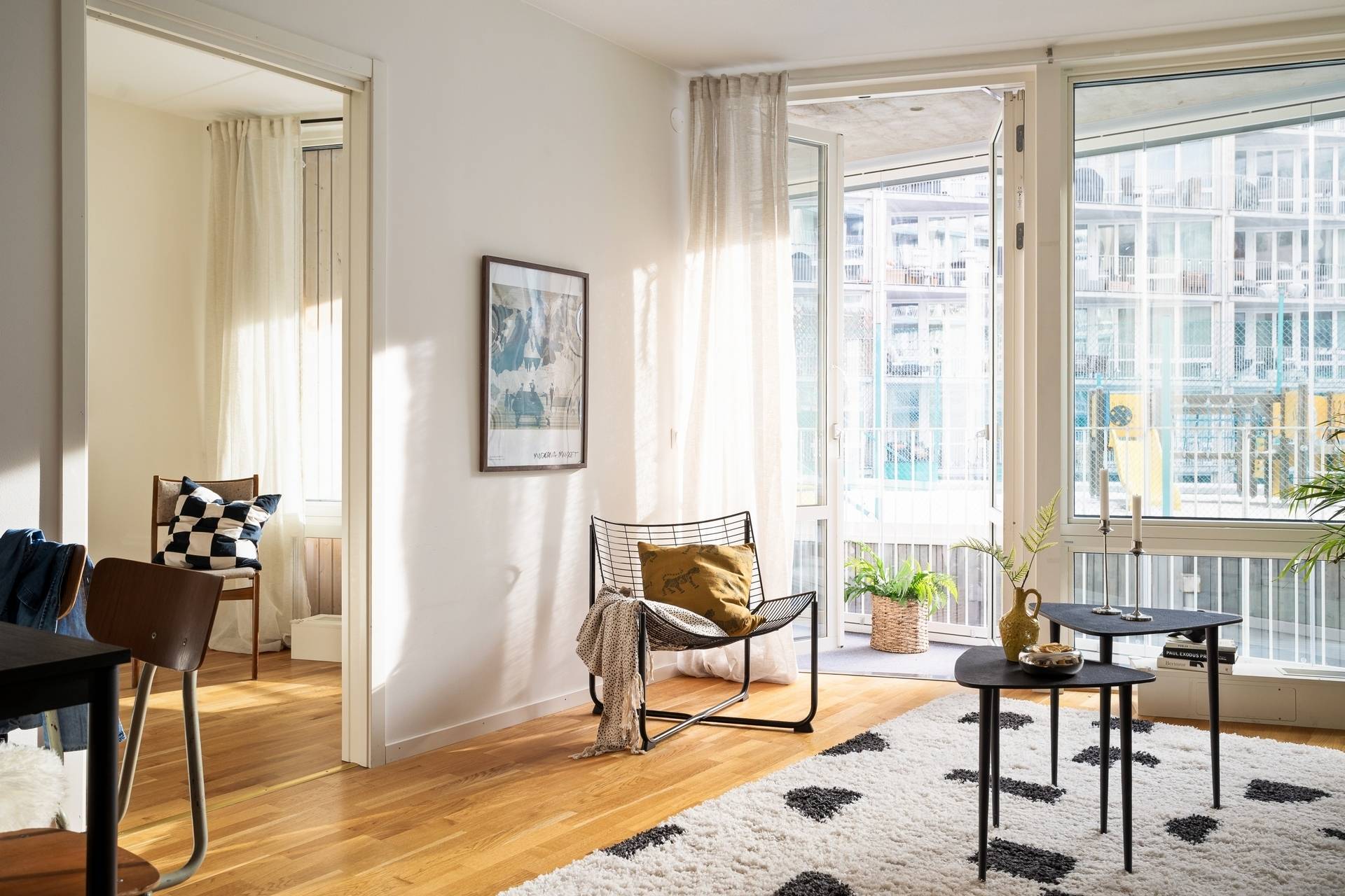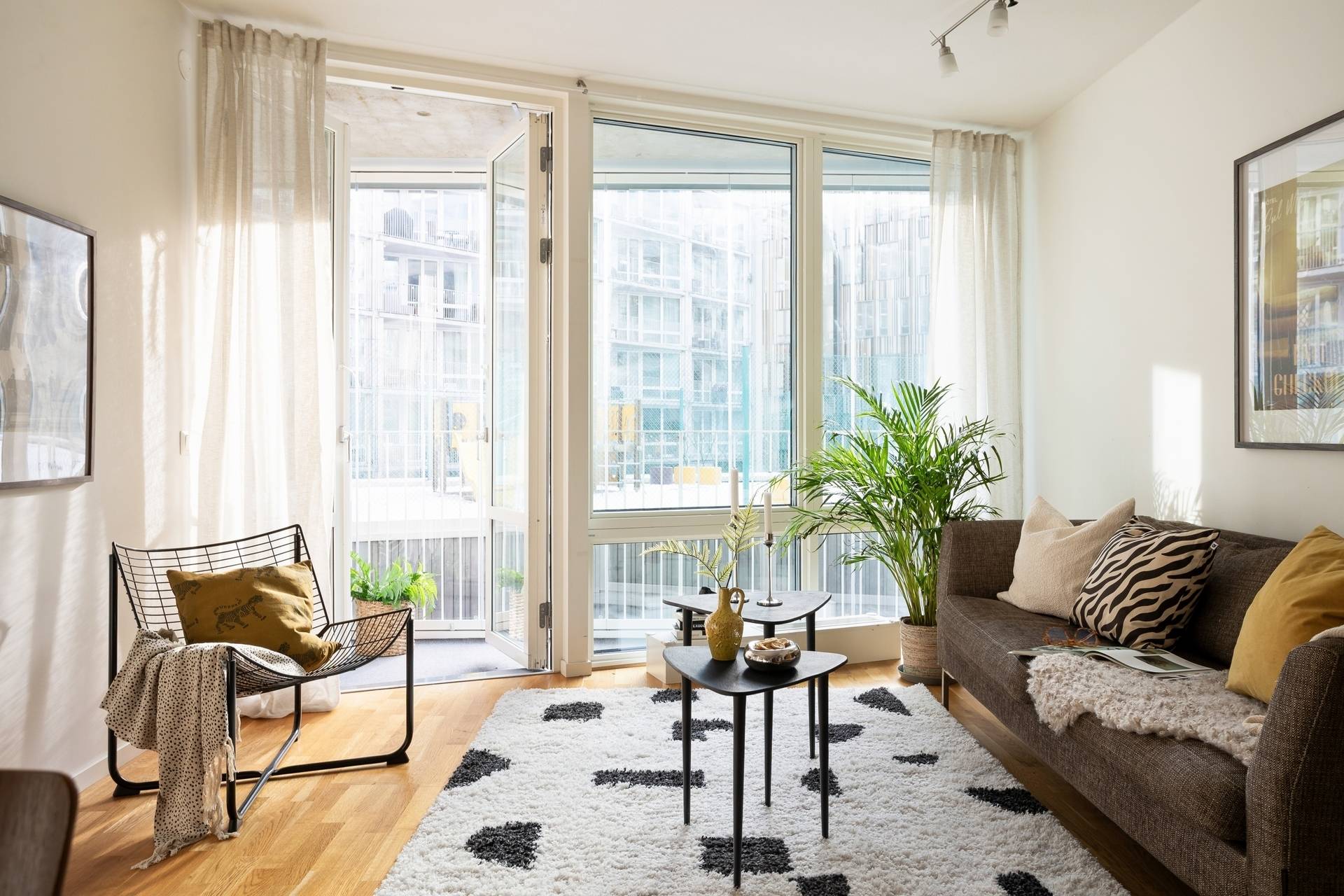 Redan vid första steget in möts du av ett imponerande ljusflöde från de stora fönsterpartierna som sträcker sig från golv till tak. Tillsammans med den öppna planlösningen skapas en luftig och inbjudande atmosfär där vardagsrum och kök samspelar i en social och trivsam helhet. De dubbla glasdörrarna leder ut till den generösa balkongen – en självklar förlängning av bostaden under årets varmare månader. Planlösningen är både genomtänkt och flexibel med goda förvaringsmöjligheter, egen tvättdel i badrummet samt ett rymligt sovrum som med enkla medel kan delas av för att skapa ytterligare ett rum – perfekt som arbetsrum, barnrum eller walk-in-closet. Här bor du med ett centralt och bekvämt läge, där vardagen blir enkel med tunnelbanan och bussar runt hörnet, Lindhagens galleria med ICA Maxi, systembolag och service i närheten samt badbryggor och Mälarens strandpromenad bara en kort promenad bort. Föreningen är stabil och klimatsmart, äger marken och erbjuder garageplatser i källarplan som nås smidigt med hiss. Till bostaden hör även ett separat förråd. Välkommen hem!53 images