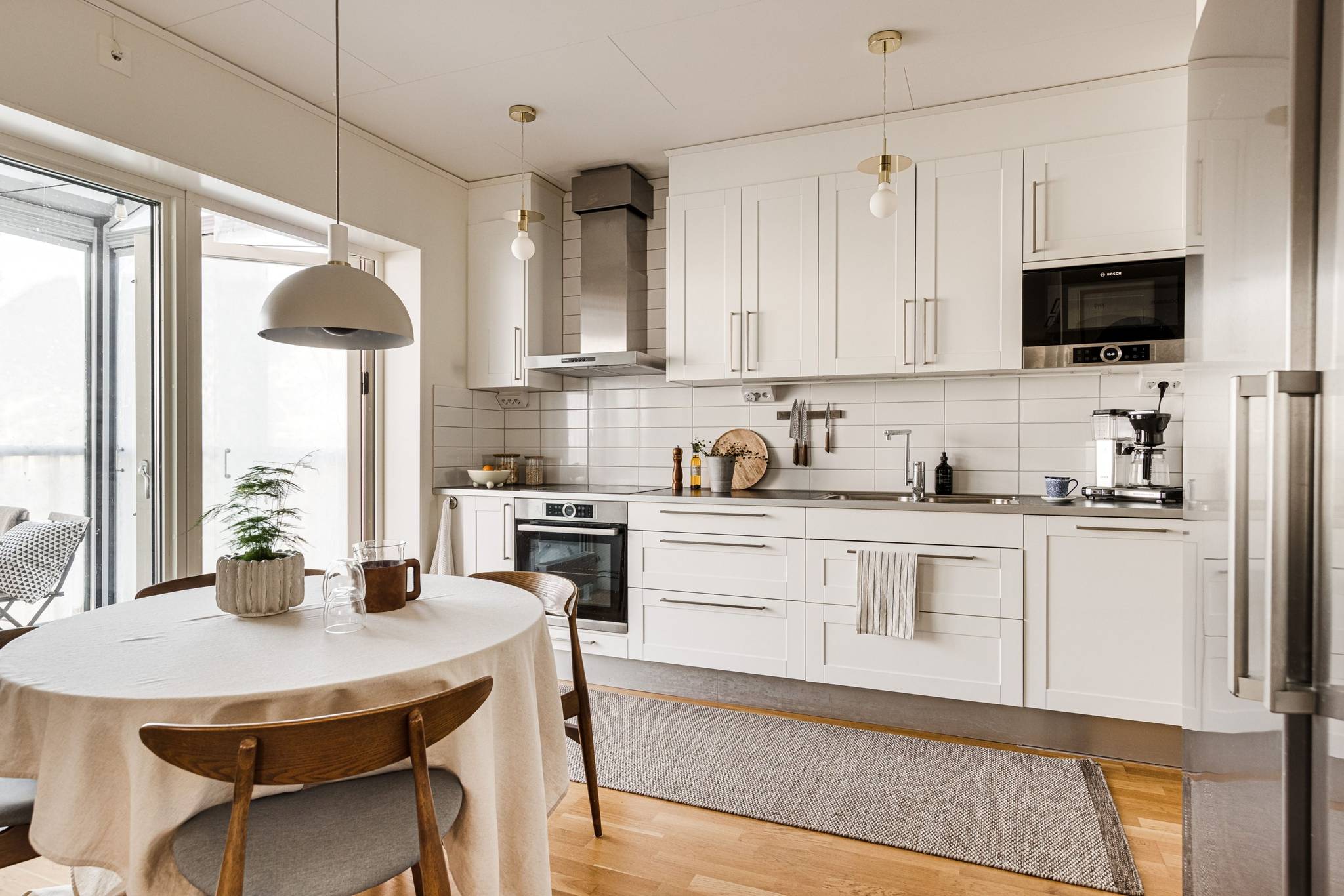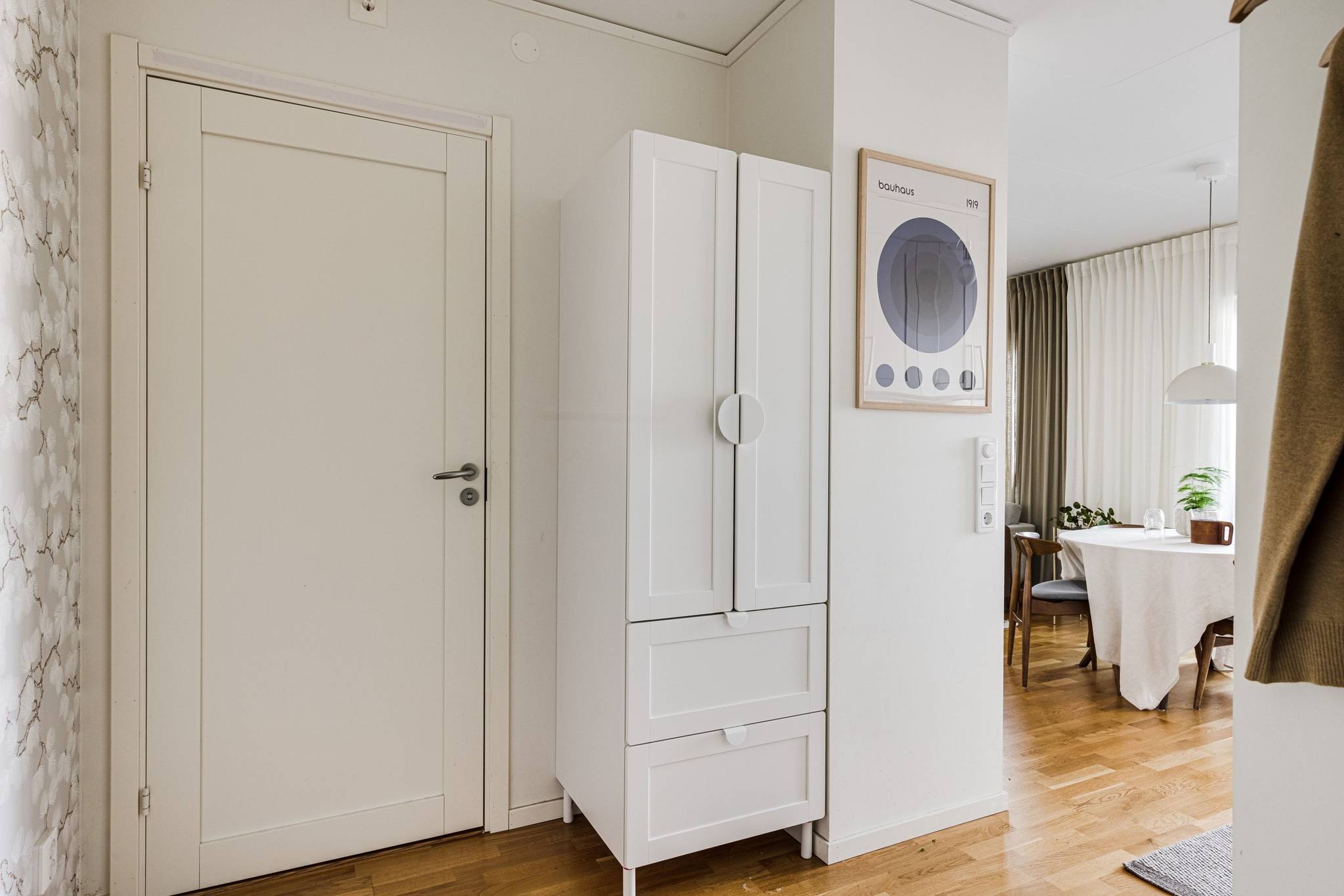 Bostaden välkomnar med generöst ljusinsläpp från stora fönsterpartier, stilren parkett och vitmålade väggar som skapar en tidlös och ljus helhet. Hallen är praktisk med goda avhängningsmöjligheter ochMore...