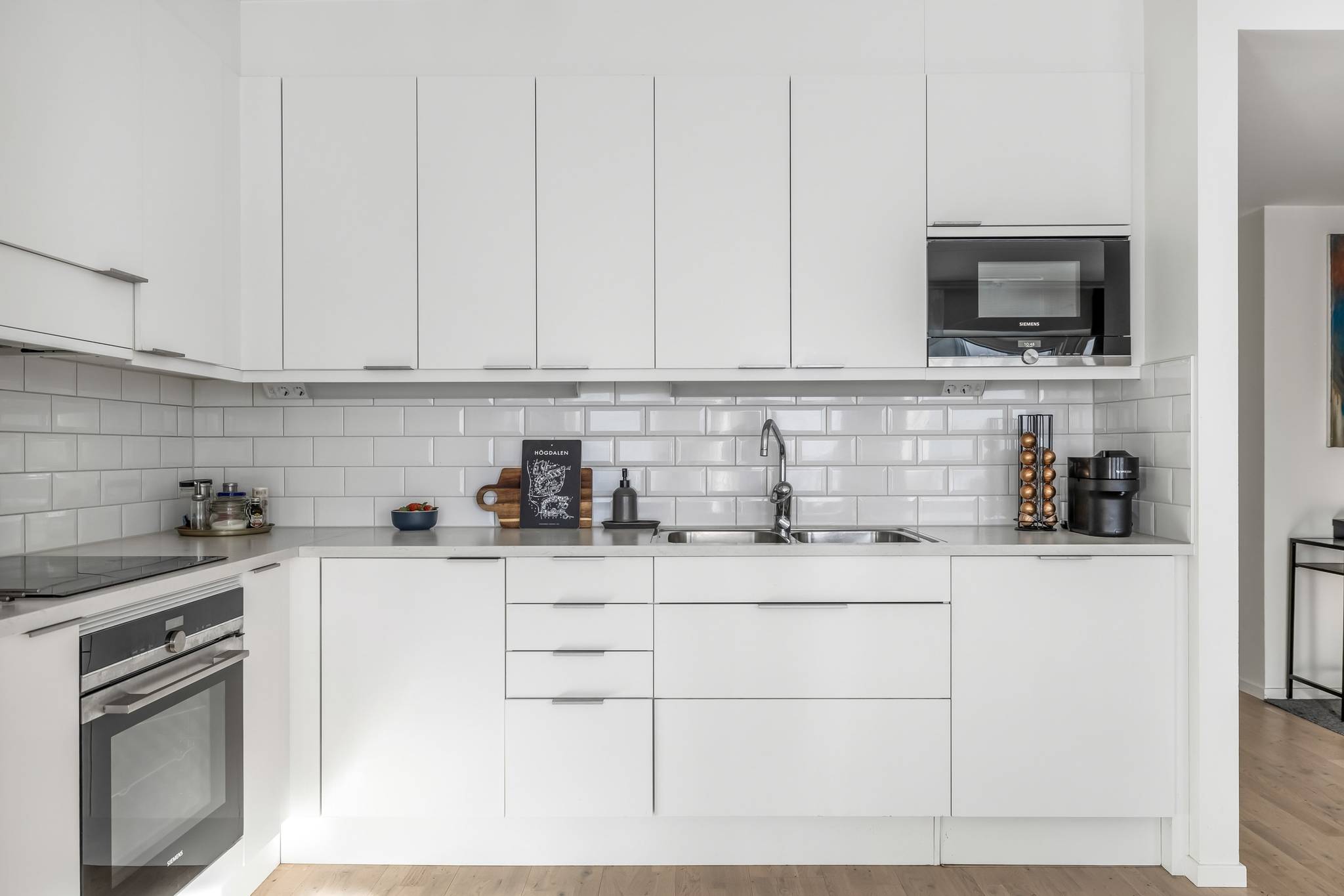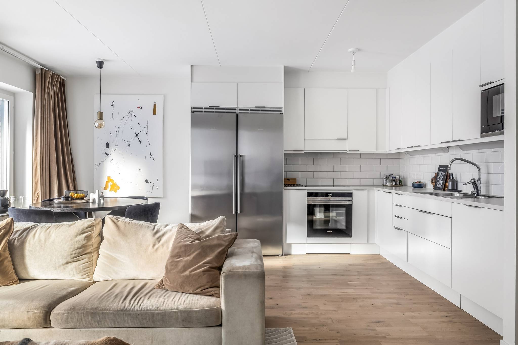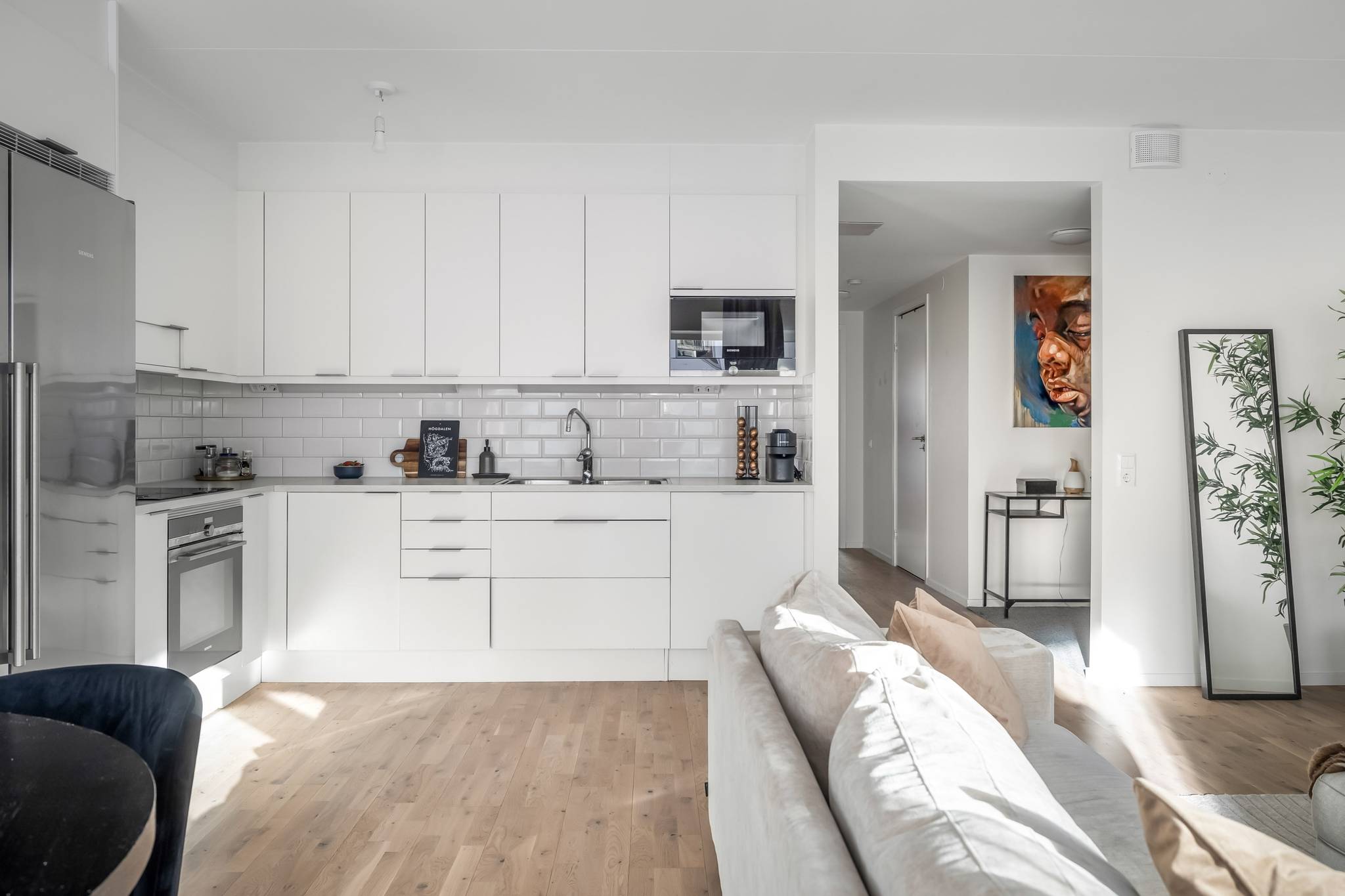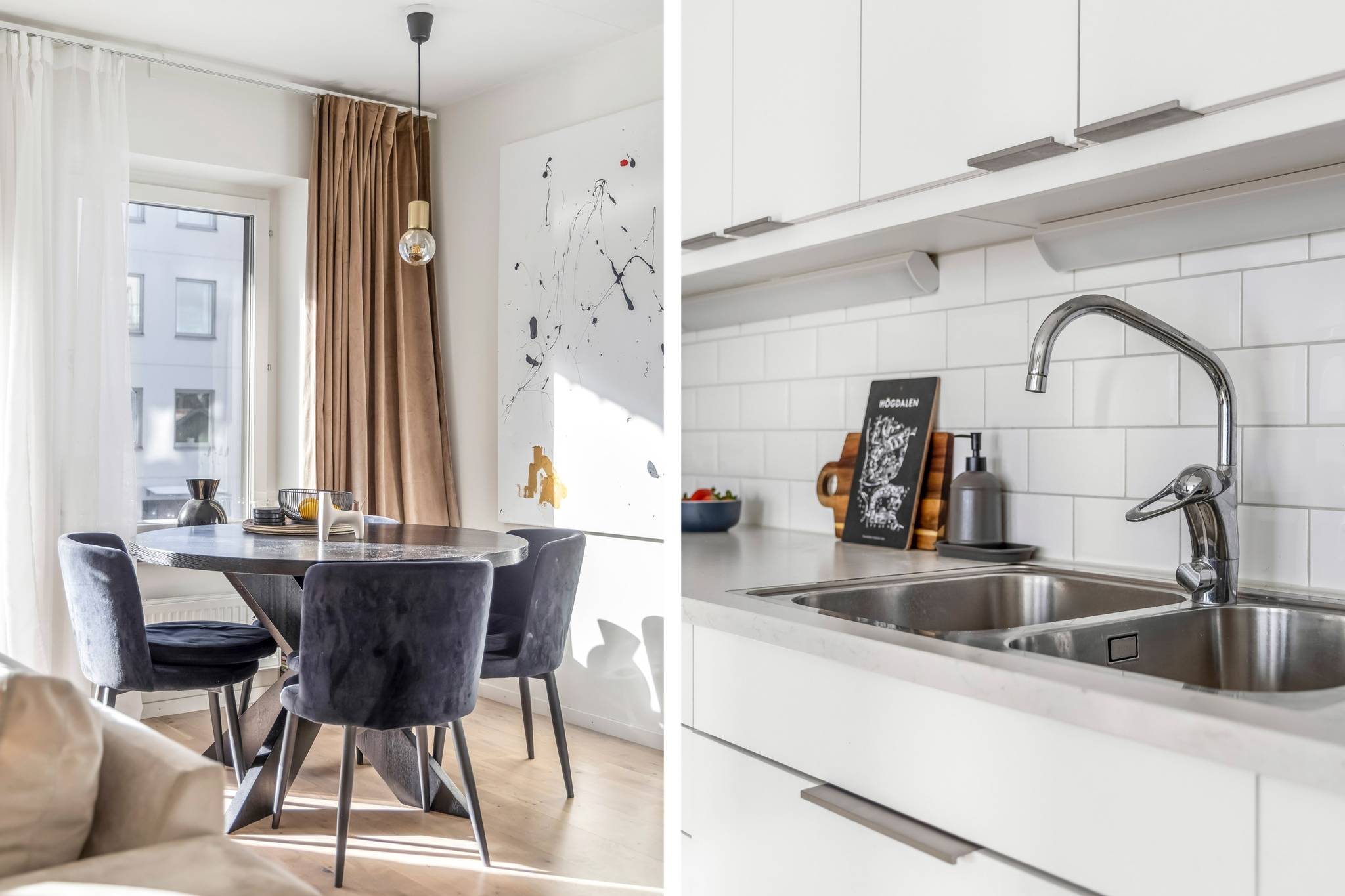 Välkommen till ett hem där nyproduktionens komfort möter genomtänkt planlösning och ett fantastiskt läge bara minuter från tunnelbana och service. Denna stilrena 3-rumslägenhet om 69 kvm, uppförd 2022, erbjuder ett boende med hög standard, generöst ljusinsläpp och sociala ytor skapade för både vardagsliv och umgänge. Här bor du i ett lugnt kvarter samtidigt som Högdalens centrum ligger bokstavligen ett stenkast bort. Ett perfekt boende för dig som vill kombinera smidiga kommunikationer, högdalens bekvämligheter och naturen inom bekvämt räckhåll. Lägenheten präglas av stora fönsterpartier med morgon- och eftermiddagssol, genomgående parkettgolv, sobra färgval och moderna material. Den öppna planlösningen mellan kök och vardagsrum skapar rymd och gör hemmet lika trivsamt till vardags som vid middagar och sociala tillställningar, där ljuset flödar in via både fönster och balkongdörren vilket skapar en luftig och harmonisk atmosfär. Balkongen är belägen mot den trevliga innergården och erbjuder en lugn plats för morgonkaffet eller kvällens avkoppling. Här erbjuds sol från morgon till eftermiddag – ett ostört läge där du kan njuta av dagens första kaffe eller koppla av i kvällssolen, med Högdalens bekvämligheter och naturen inom bekvämt räckhåll. Köket är modernt och elegant utformat med släta vita luckor, vitt kakel ovan bänkskivan och en stilfull marmorbänkskiva som tillsammans med generösa arbetsytor skapar en exklusiv och inbjudande helhet, perfekt för både matlagning och umgänge. Den fulla maskinella utrustningen i rostfritt utförande kombinerar funktion och estetik och intill fönsterpartiet finns gott om plats för en större matgrupp som blir en naturlig samlingspunkt i hemmet. Vardagsrummet erbjuder utrymme för en generös soffgrupp och mediadel utan att kompromissa med utrymme. Bostaden erbjuder två välplanerade sovrum. Det större sovrummet har plats för dubbelsäng och sängbord och kompletteras av en stor och exklusiv walk-in-closet som ger utmärkta förvaringsmöjligheter och en hotelliknande känsla i vardagen. Det andra sovrummet är ljust och lättmöblerat och passar perfekt som barnrum, gästrum eller hemmakontor. Badrummet är stilrent helkaklat i ljusa, harmoniska toner med tydlig nordisk design där kakel och klinker samspelar i en modern och tidlös färgsättning. Här finns en rymlig duschhörna med glasdörrar, kommod med förvaring samt spegelskåp med belysning som ger ett behagligt ljus. Infällda spotlights tillsammans med golvvärme skapar en varm och ombonad känsla. Den genomtänkta planeringen förenar estetik och funktion och badrummet kompletteras av en praktisk tvättdel med tvättmaskin och torktumlare placerade ovan varandra vilket frigör golvyta och förenklar vardagen. Hallen välkomnar med ett luftigt intryck och goda avhängningsmöjligheter. Här finns även ett praktiskt förråd som erbjuder extra förvaring i vardagen. Förvaringsmöjligheterna är väl tilltagna och kompletteras av en walk in closet i anslutning till sovrummet vilket ger gott om plats för både kläder och säsongsförvaring. Brf Regissören i Teaterkvarteret är en äkta bostadsrättsförening som äger marken och består av 52 lägenheter. Den nyproducerade fastigheten från 2022 innebär lågt underhållsbehov och en trygg ekonomi. Föreningen erbjuder garage med 20 parkeringsplatser, 2 st MC-platser som är beläget direkt under kvarteret. Källarförråd, 3-glasfönster och uppvärmning via fjärrvärme. Här bor du centralt men lugnt med direkt närhet till allt. Tunnel37 images