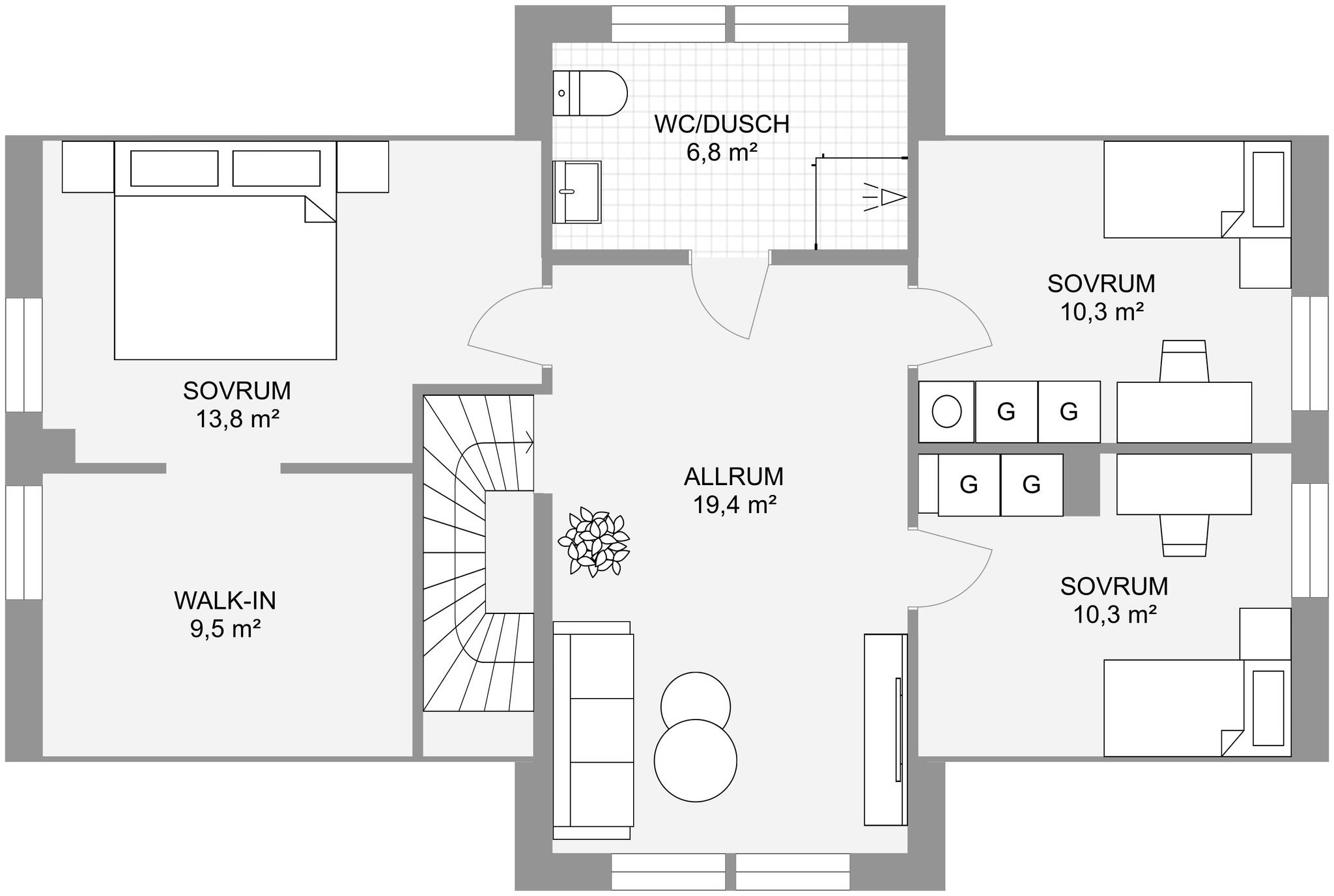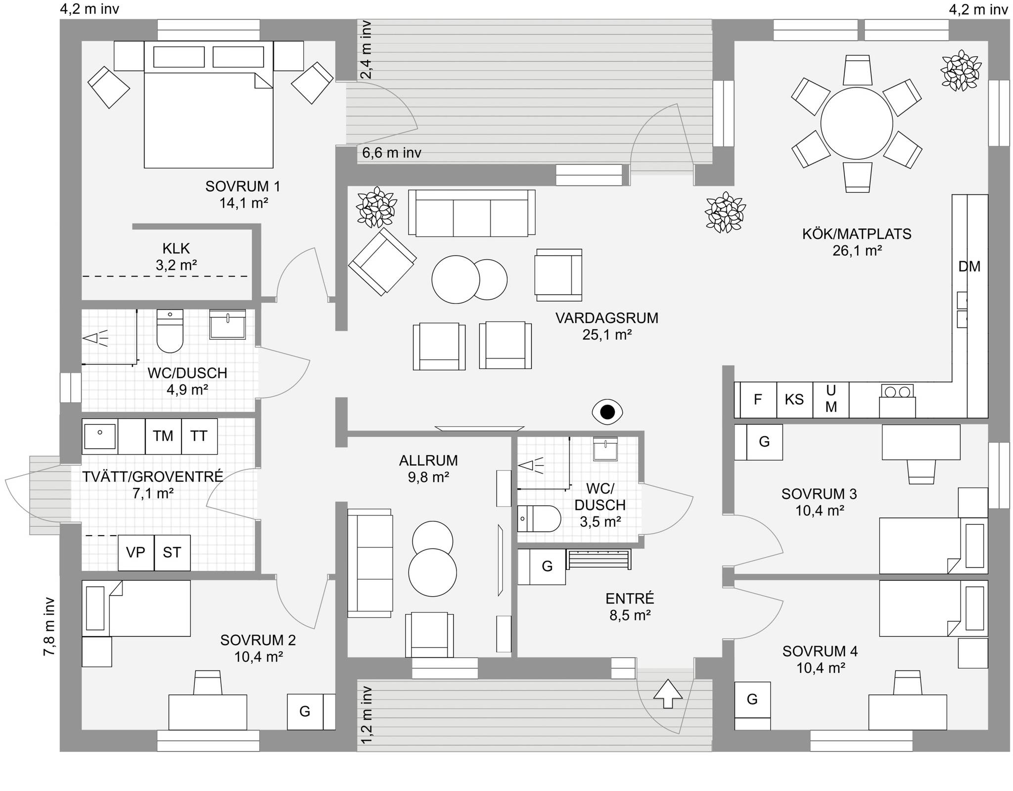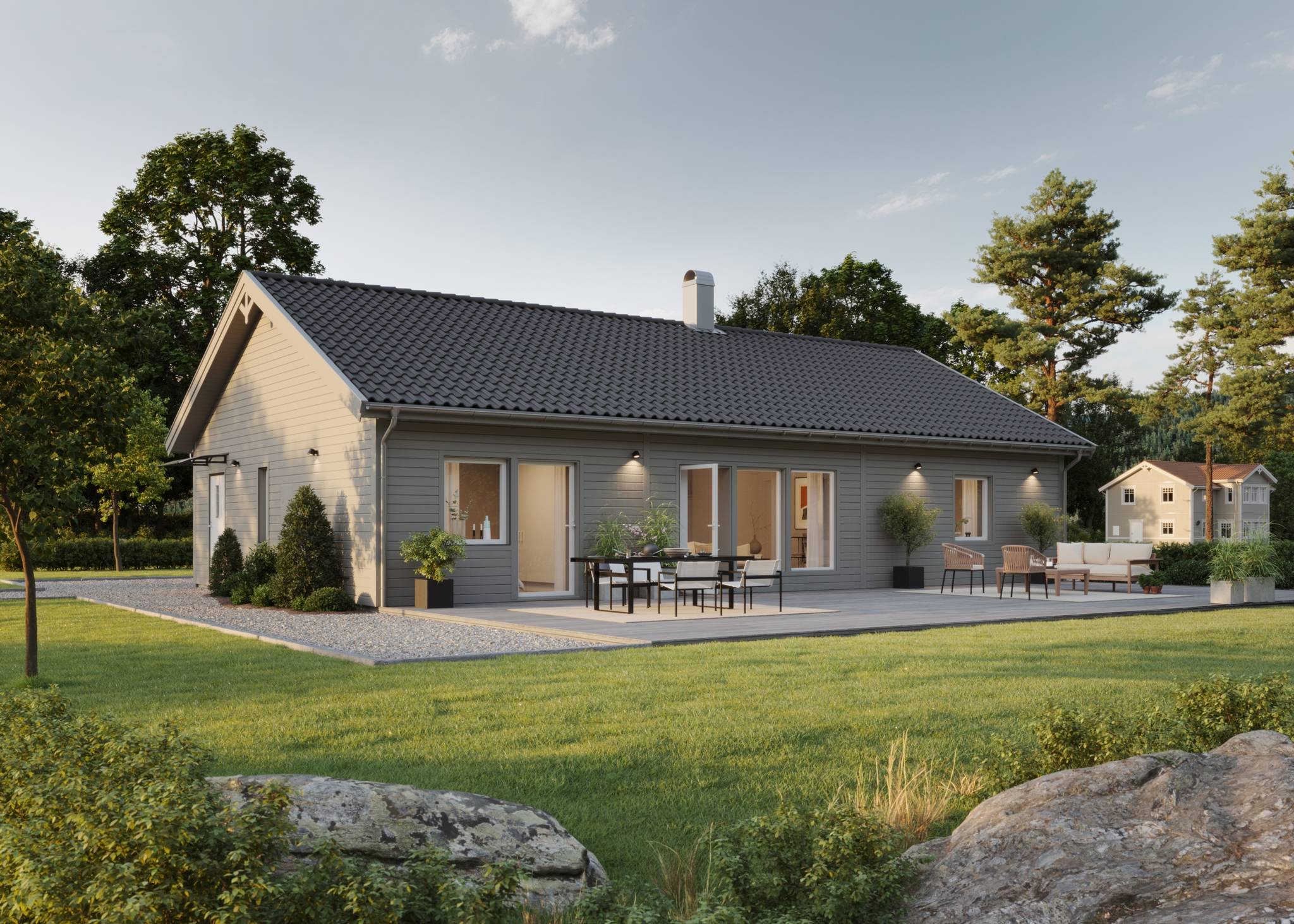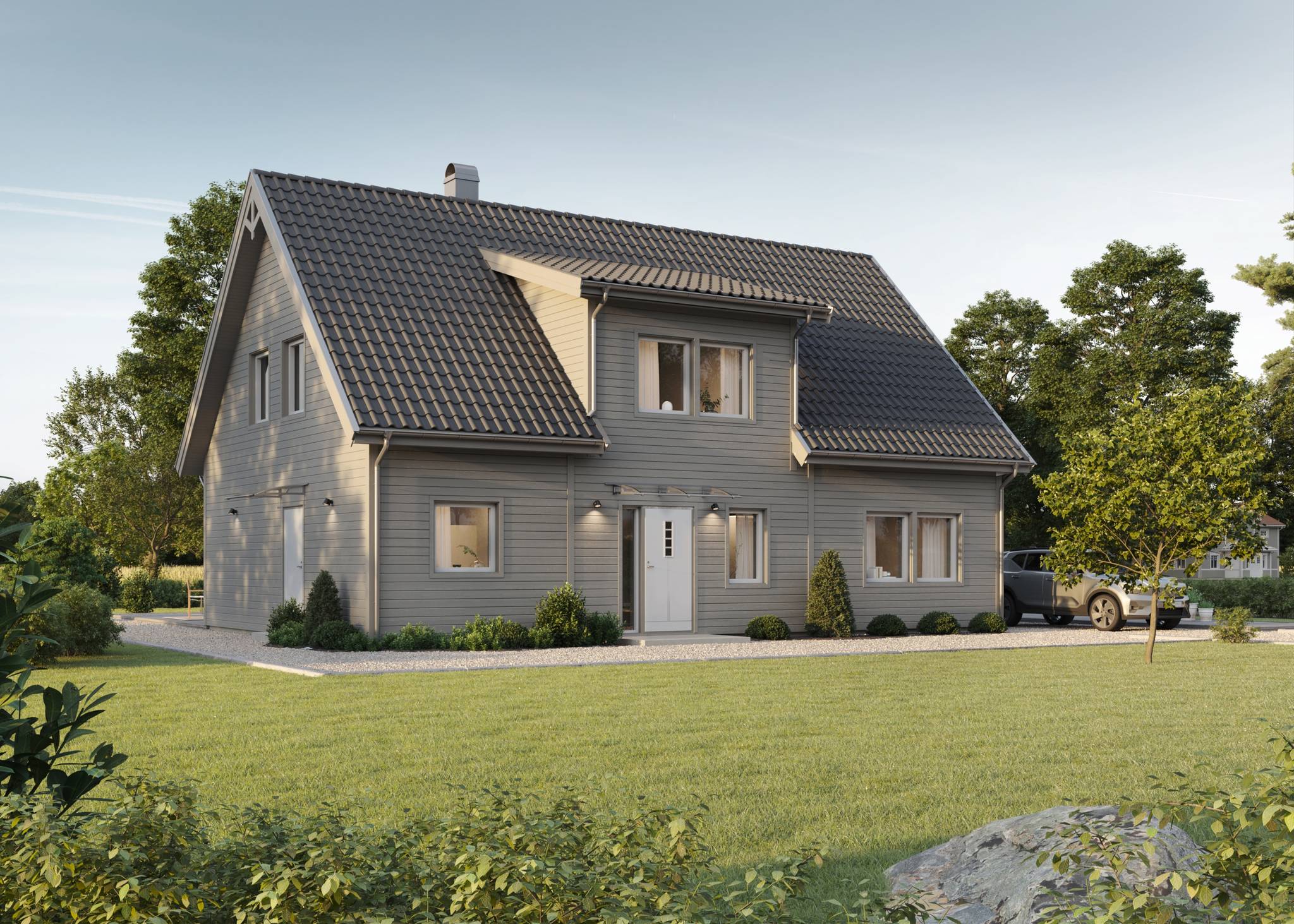 Nyckelfärdigt hus med tomt från 4 395 000 kr Drömmer du om att bygga nytt i naturnära miljö? Nu finns möjligheten att förvärva en tomt med helentreprenad från Bra Hus – ett perfekt tillfälle för dig som vill skapa ett hem helt efter dina egna visioner. Välj bland flera genomtänkta husmodeller eller låt fantasin flöda och rita ditt eget hus utifrån personliga önskemål och behov. I charmiga Mellansvartbäck bor du med naturen och grönskan som närmsta granne, samtidigt som den vackra Bjännsjön ligger endast ett stenkast bort – idealiskt för såväl avkopplande promenader som aktiva dagar utomhus. Här får du det bästa av två världar: ett lugnt och naturskönt läge med närhet till friluftsliv, men utan att kompromissa med tillgängligheten. Centrala Umeå nås enkelt med en kort bilfärd, och goda kommunikationsmöjligheter gör vardagen smidig för både arbete och fritid. Välkommen att ta första steget mot ditt framtida drömboende! PS. Bilderna är datorgenererade och visar hur ett färdigt hus i denna affär kan se ut. Modell – Plan – Boyta – Byggyta – Antal rum Smultronstället 94 – 1 planshus – 93,6 m² – 108,4 m² – 3 rok Smultronstället 112 – 1 planshus – 112,3 m² – 128,8 m² – 4 rok Smultronstället 121 – 1 planshus – 121,0 m² – 137,9 m² – 5 rok Smultronstället 135 – 1 planshus – 135,4 m² – 157,0 m² – 4 rok Smultronstället 141 – 1 planshus – 141,1 m² – 161,9 m² – 5 rok Smultronstället 147 – 1 planshus – 147,2 m² – 169,4 m² – 6 rok Smultronstället 151 – 1 planshus – 151,2 m² – 170,3 m² – 5 rok Smultronstället 169 – 1,5 planshus – 168,7 m² – 108,4 m² – 6 rok Smultronstället 156 - 2 planshus utan/med carport – 155,6 m²- 6–7 rok https://www.brahus.se/vara-hus/smultronstallet/ Här väljer vi att premiera ''Smultronstället-husen'' vilket är Bra Hus mest prisvärda husmodeller och ger dig mycket för pengarna! Pris varierar beroende på husvariant. Det går även att välja andra modeller, arkitektritat eller något av de hus ni finner i nedanstående länk. Länk till alla modeller: https://www.brahus.se/vara-hus/ Livolo Bygg AB kompletterar med arbete, betongplatta samt kakel, klinker, spackel och invändig målning – så att huset blir helt nyckelfärdigt. Skog på tomt är till stor del röjd och innebär ingen extra kostnad. Bygglovshandlingar ingår i priset. Kostnader som kunden själv behöver ta hänsyn till (ingår ej): - Bygg-el: ca 10 000 - 25 000 kr beroende på årstid. - Geoteknisk undersökning: ca 33 000 kr - Anslutningsavgifter: VA (kommunalt): ca 290 000 kr. El: ca 50 000 kr - Bygglovskostnader: Nybyggnadskarta ca 10 000 kr, startbesked ca 40 000 kr, utstakning ca 12 000 kr. - Kontrollansvarig: ca 20 000 - 30 000 kr beroende på hur många platsbesök som krävs. Drift per år (schablonberäknat): - Försäkring: 5 000 kr - Vatten/avlopp: 2 600 kr - Elförbrukning: 18 000 kr, 10 000 kWh (hushållsel samt uppvärmning) - Renhållning: 1 800 kr Summa: 27 400 kr/år (preliminär, varierar beroende på förbrukning och avtal) Ytterligare dokument gällande konstruktion, materialval, tillval, https://www.brahus.se/bygga-hus/bra-hus-konstruktion/ https://standardochtillval.brahus.se/produkt/e/905/franluftsvarmepump-s735/25 images