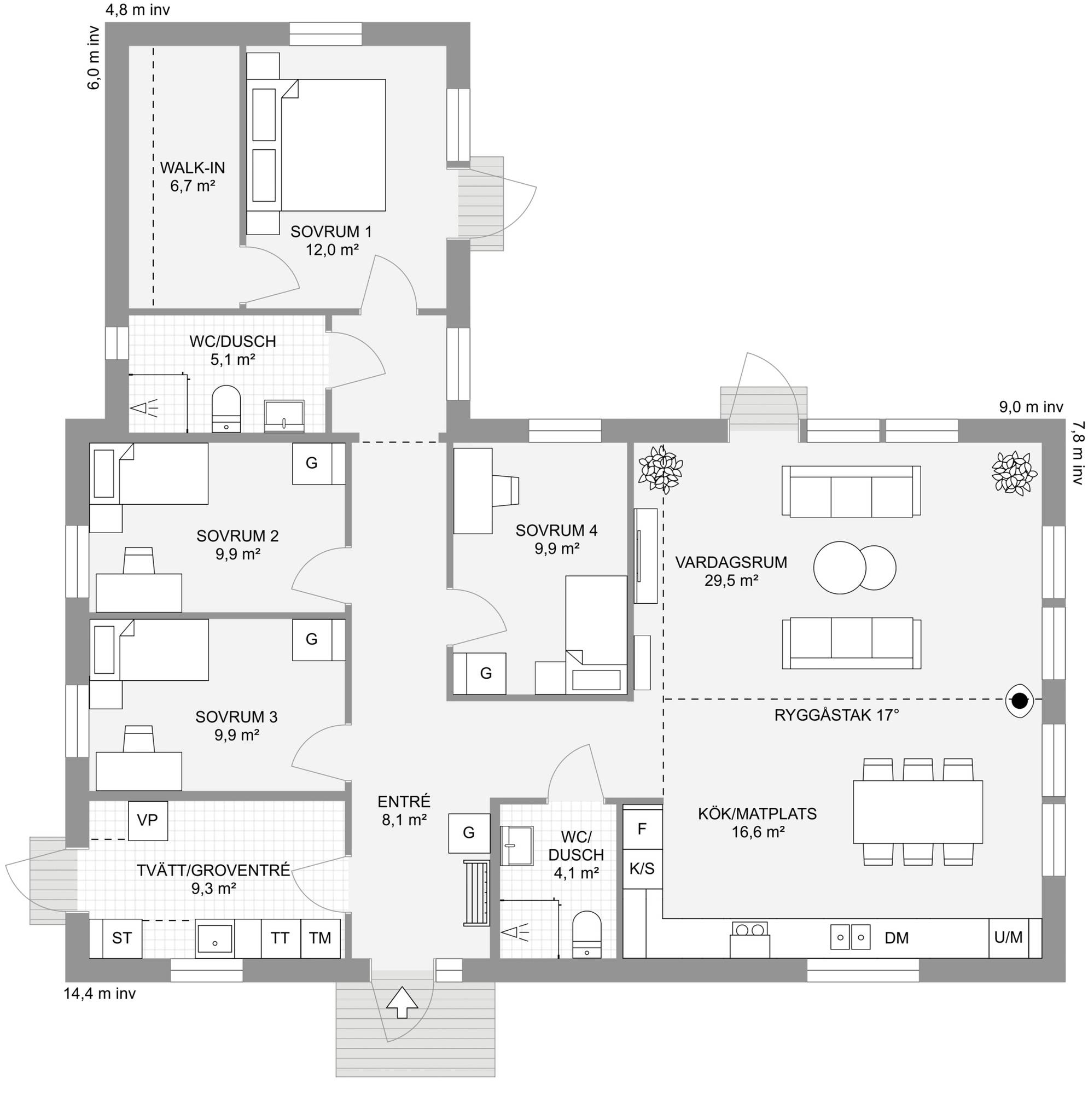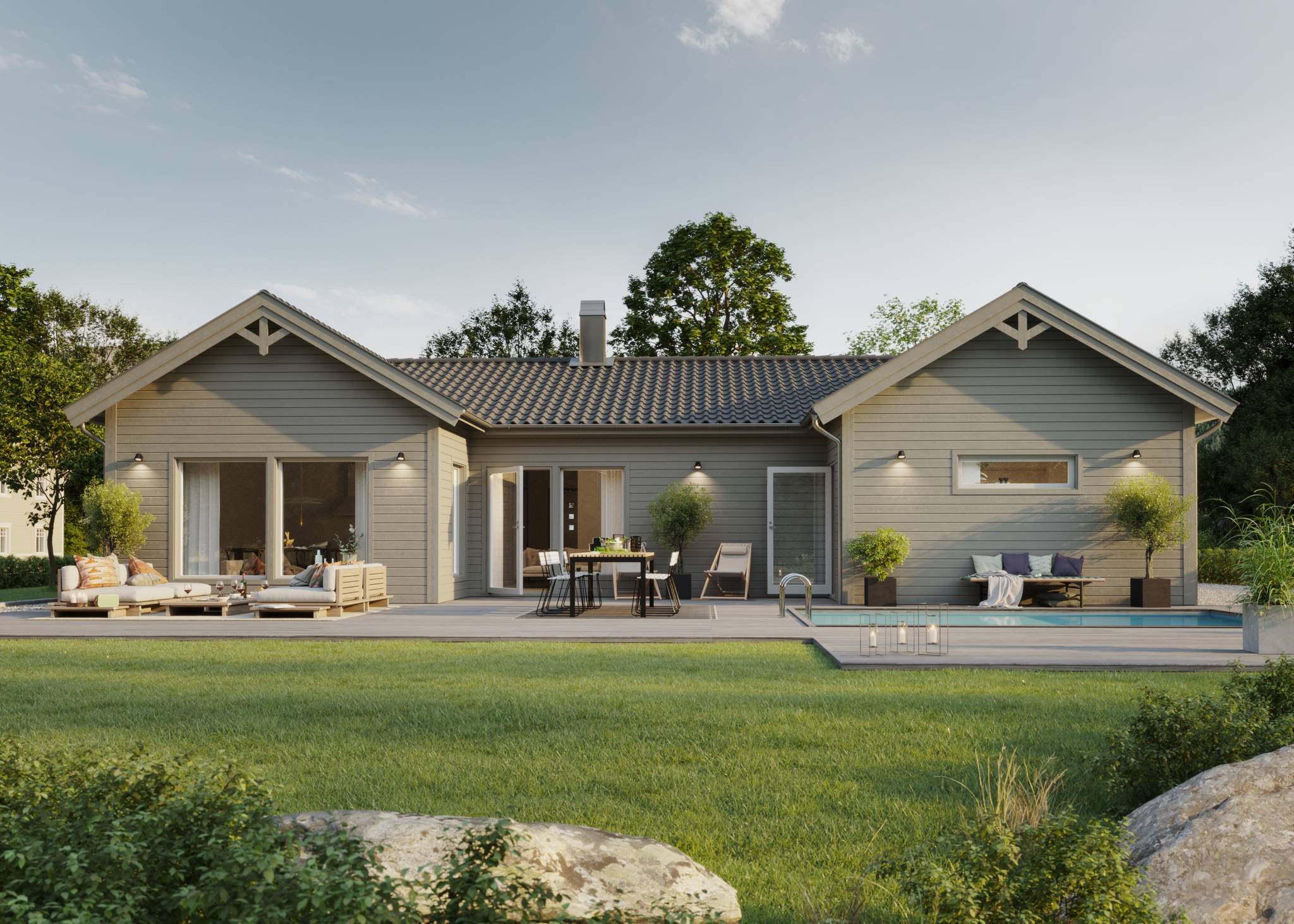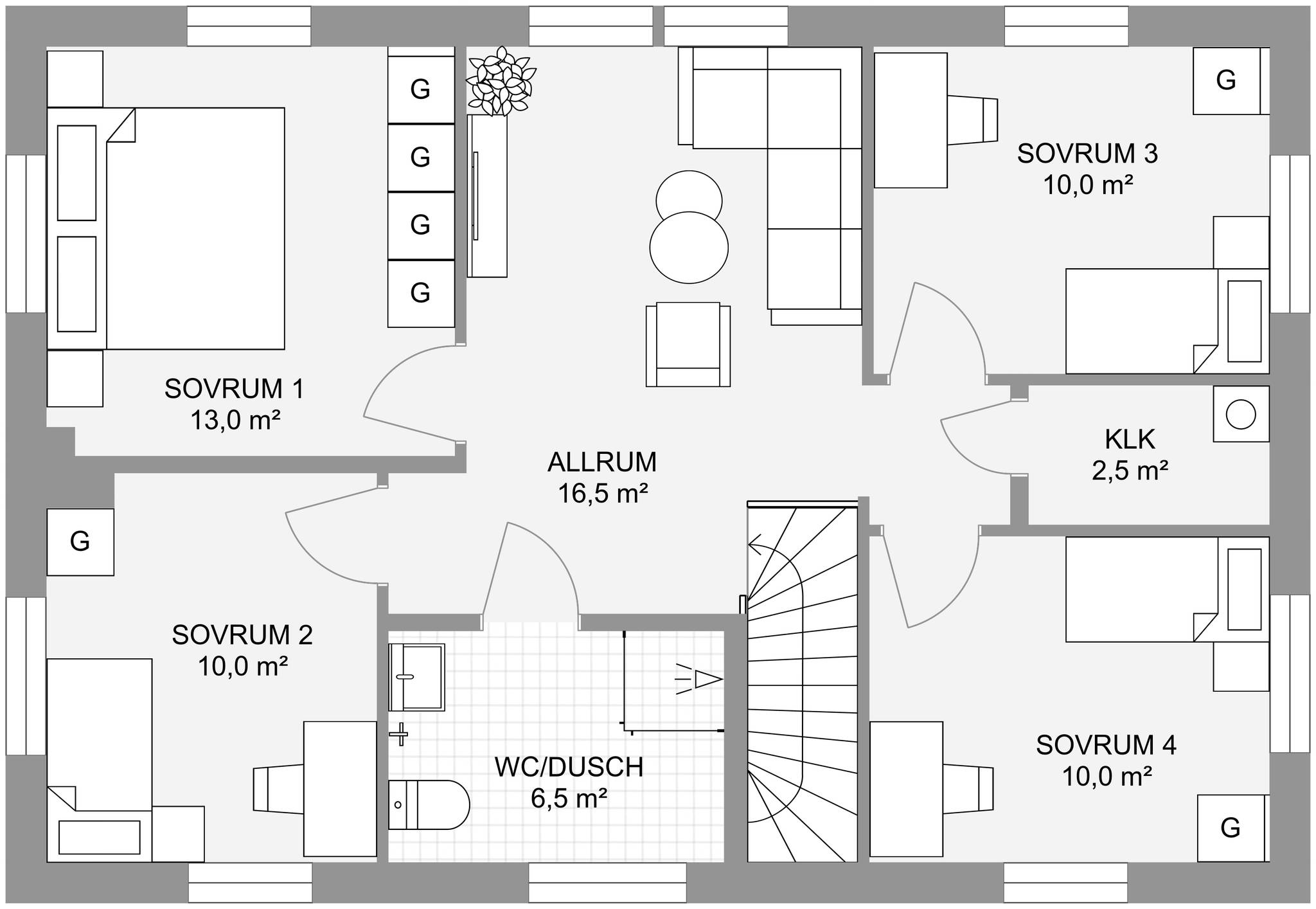 Nyckelfärdigt hus med tomt från 4 395 000 kr Drömmer du om att bygga nytt i naturnära miljö? Nu finns möjligheten att förvärva en tomt med helentreprenad från Bra Hus – ett perfekt tillfälle för dig som vill skapa ett hem helt efter dina egna visioner. Välj bland flera genomtänkta husmodeller eller låt fantasin flöda och rita ditt eget hus utifrån personliga önskemål och behov. I charmiga Mellansvartbäck bor du med naturen och grönskan som närmsta granne, samtidigt som den vackra Bjännsjön ligger endast ett stenkast bort – idealiskt för såväl avkopplande promenader som aktiva dagar utomhus. Här får du det bästa av två världar: ett lugnt och naturskönt läge med närhet till friluftsliv, men utan att kompromissa med tillgängligheten. Centrala Umeå nås enkelt med en kort bilfärd, och goda kommunikationsmöjligheter gör vardagen smidig för både arbete och fritid. Välkommen att ta första steget mot ditt framtida drömboende! PS. Bilderna är datorgenererade och visar hur ett färdigt hus i denna affär kan se ut. Modell – Plan – Boyta – Byggyta – Antal rum Smultronstället 94 – 1 planshus – 93,6 m² – 108,4 m² – 3 rok Smultronstället 112 – 1 planshus – 112,3 m² – 128,8 m² – 4 rok Smultronstället 121 – 1 planshus – 121,0 m² – 137,9 m² – 5 rok Smultronstället 135 – 1 planshus – 135,4 m² – 157,0 m² – 4 rok Smultronstället 141 – 1 planshus – 141,1 m² – 161,9 m² – 5 rok Smultronstället 147 – 1 planshus – 147,2 m² – 169,4 m² – 6 rok Smultronstället 151 – 1 planshus – 151,2 m² – 170,3 m² – 5 rok Smultronstället 169 – 1,5 planshus – 168,7 m² – 108,4 m² – 6 rok Smultronstället 156 - 2 planshus utan/med carport – 155,6 m²- 6–7 rok https://www.brahus.se/vara-hus/smultronstallet/ Här väljer vi att premiera ''Smultronstället-husen'' vilket är Bra Hus mest prisvärda husmodeller och ger dig mycket för pengarna! Pris varierar beroende på husvariant. Det går även att välja andra modeller, arkitektritat eller något av de hus ni finner i nedanstående länk. Länk till alla modeller: https://www.brahus.se/vara-hus/ Livolo Bygg AB kompletterar med arbete, betongplatta samt kakel, klinker, spackel och invändig målning – så att huset blir helt nyckelfärdigt. Skog på tomt är till stor del röjd och innebär ingen extra kostnad. Bygglovshandlingar ingår i priset. Kostnader som kunden själv behöver ta hänsyn till (ingår ej): - Bygg-el: ca 10 000 - 25 000 kr beroende på årstid. - Geoteknisk undersökning: ca 33 000 kr - Anslutningsavgifter: VA (kommunalt): ca 290 000 kr. El: ca 50 000 kr - Bygglovskostnader: Nybyggnadskarta ca 10 000 kr, startbesked ca 40 000 kr, utstakning ca 12 000 kr. - Kontrollansvarig: ca 20 000 - 30 000 kr beroende på hur många platsbesök som krävs. Drift per år (schablonberäknat): - Försäkring: 5 000 kr - Vatten/avlopp: 2 600 kr - Elförbrukning: 18 000 kr, 10 000 kWh (hushållsel samt uppvärmning) - Renhållning: 1 800 kr Summa: 27 400 kr/år (preliminär, varierar beroende på förbrukning och avtal) Ytterligare dokument gällande konstruktion, materialval, tillval, https://www.brahus.se/bygga-hus/bra-hus-konstruktion/ https://standardochtillval.brahus.se/produkt/e/905/franluftsvarmepump-s735/25 images