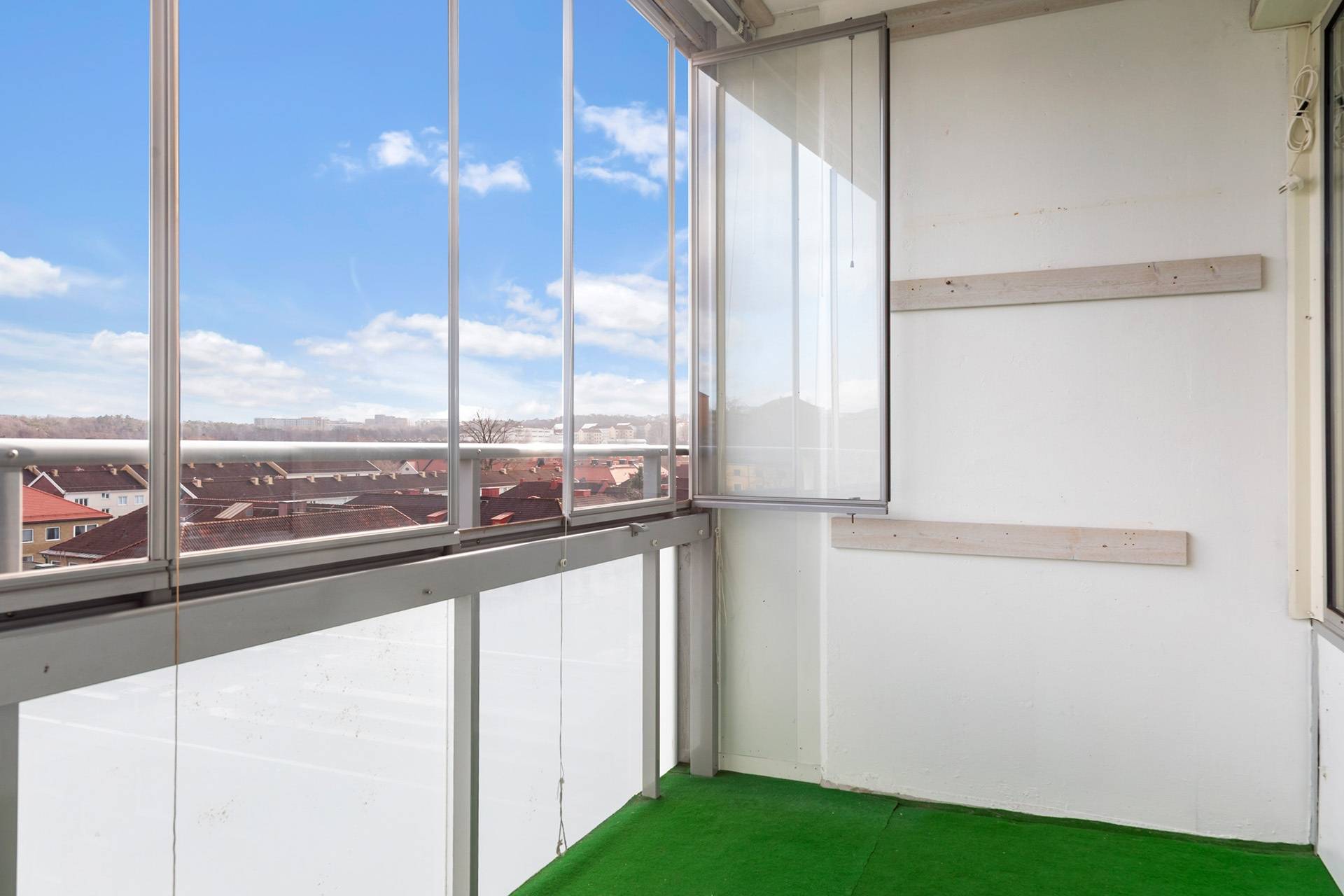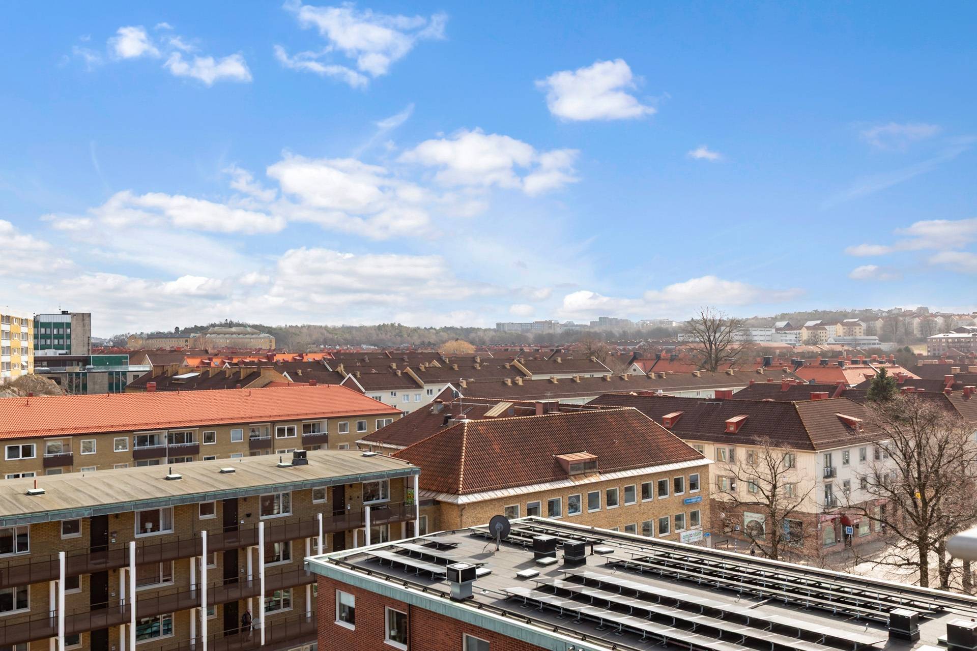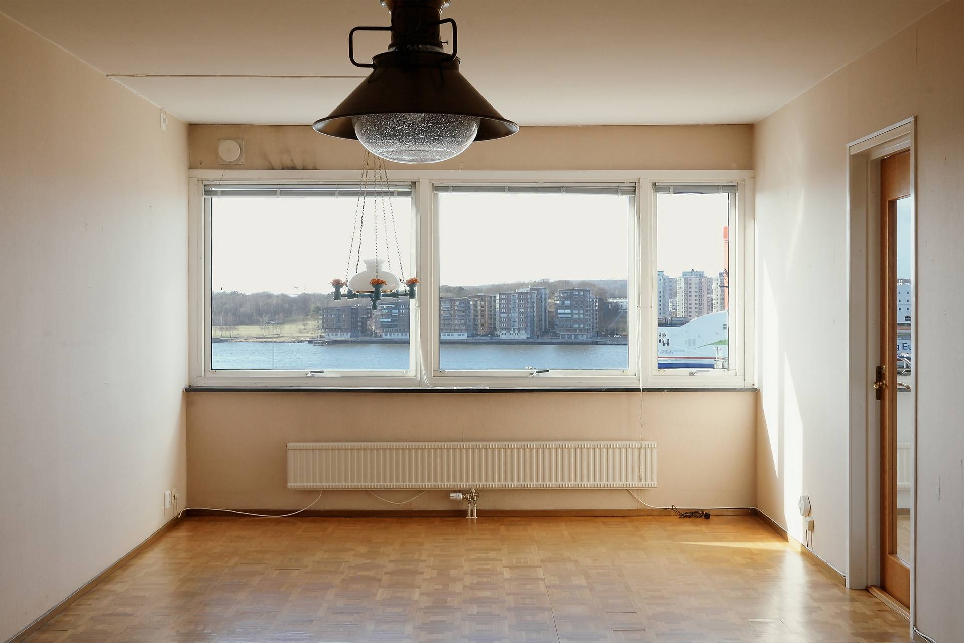 Det finns utsikter som förändrar hur man upplever ett hem. Från sjunde våningen på Gröna Gatan 65 öppnar sig ett panorama över Göta älv, Älvsborgsbron och Göteborgs hamninlopp – ett levande och skiftande landskap som förändras med ljuset, årstiderna och vädret. Det är en vy som är svår att lämna på morgonen och svår att glömma på kvällen, och den genomsyrar hela upplevelsen av att bo här. Lägenheten rymmer tre välproportionerade rum med en planlösning som sitter rätt. Vardagsrummet är generöst tilltaget och rymmer bekvämt en stor soffgrupp och matplats med god marginal – ett rum som trivs med folk och som fungerar lika bra för en stilla hemmakväll som för att ta emot gäster. Köket är välproportionerat med en separat matplats, en naturlig samlingsplats för frukost och familjemiddag, och med goda förutsättningar för den som vill uppgradera till ett kök efter eget tycke. Det stora sovrummet har en direktkoppling till det som är en av lägenhetens mest karaktärsfulla kvaliteter: den inglasade balkongen om ca 6 kvm. Det är ett uterum som faktiskt går att använda under större delen av året – för morgonkaffet i mars, en bok en blåsig hösteftermiddag, eller som en stilla observationspost under sommarkvällarna. Inglasningen gör balkongen till ett eget rum, ett mellanting mellan inne och ute som snabbt blir svårt att klara sig utan. Det andra sovrummet är rymligt och välformat med plats för dubbelsäng och tillhörande möblemang. Entrén är rymlig och välkomnande med goda förvaringsmöjligheter, och en separat klädkammare inne i bostaden löser ytterligare förvaring utan att inkräkta på de boendes rum. Badrummet är helrenoverat av föreningen i samband med stambytet 2018/2019 – med vita kakelplattor på väggar, beige/gult golvkakel, vit kommod med riklig förvaring och vägghängd toalett. Badrummet är även förberett med el, vatten och avlopp för att sätta in en tvättmaskin. Klart att flytta in i, och ett tryggt fundament inför den renovering av resten av lägenheten som väntar den nye ägaren. Interiören i övrigt bär en tydlig och ärlig 70-talsprägel. Det är en canvas snarare än ett färdigt hem – och sällan erbjuder marknaden möjligheten att renovera fritt i ett läge av den här kalibern, i en förening med det här underhållsläget, med den här utsikten inkluderad från dag ett. Hissen – faktiskt två stycken, en större och en mindre – gör att läget på sjunde våningen är en tillgång utan avkall.31 images