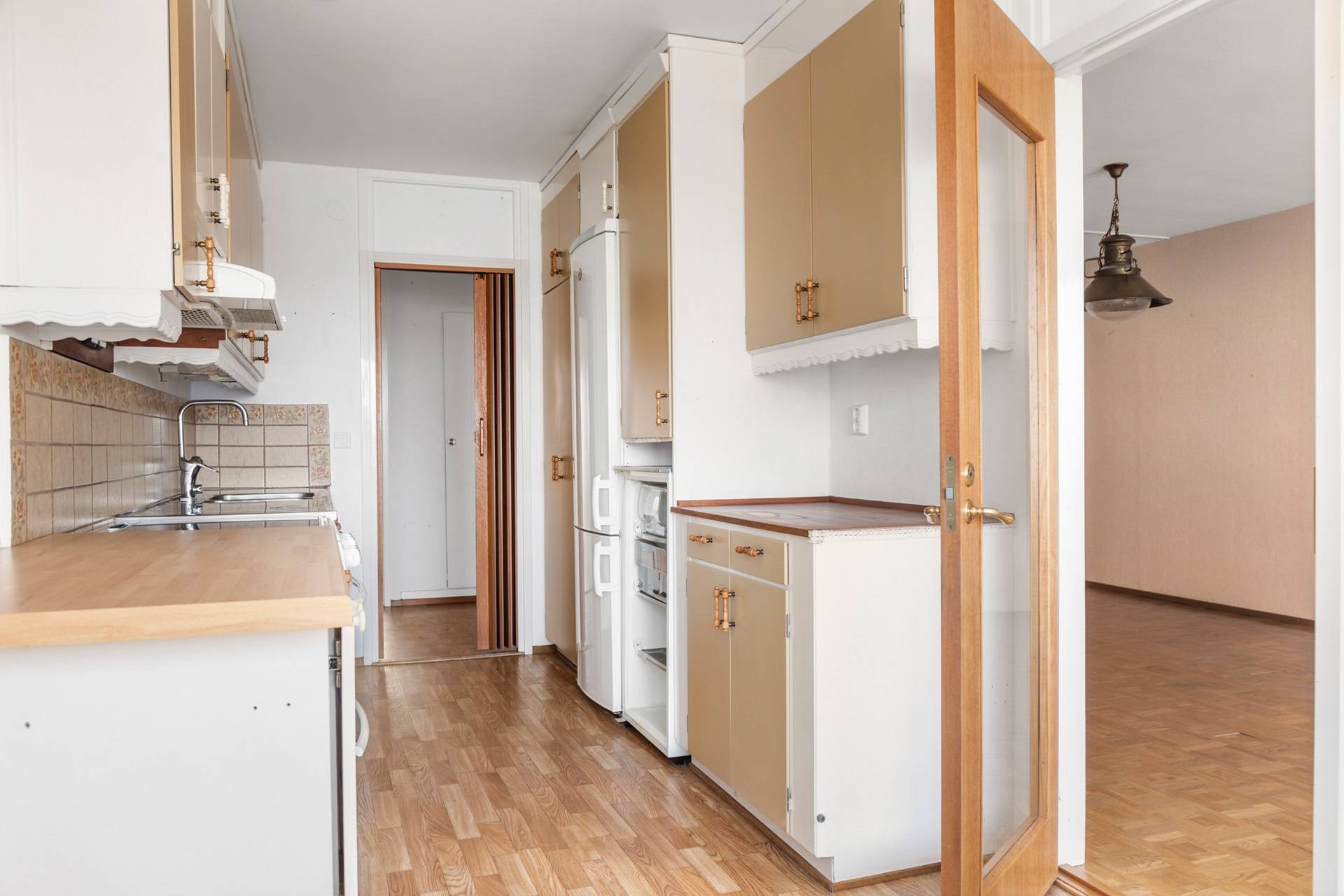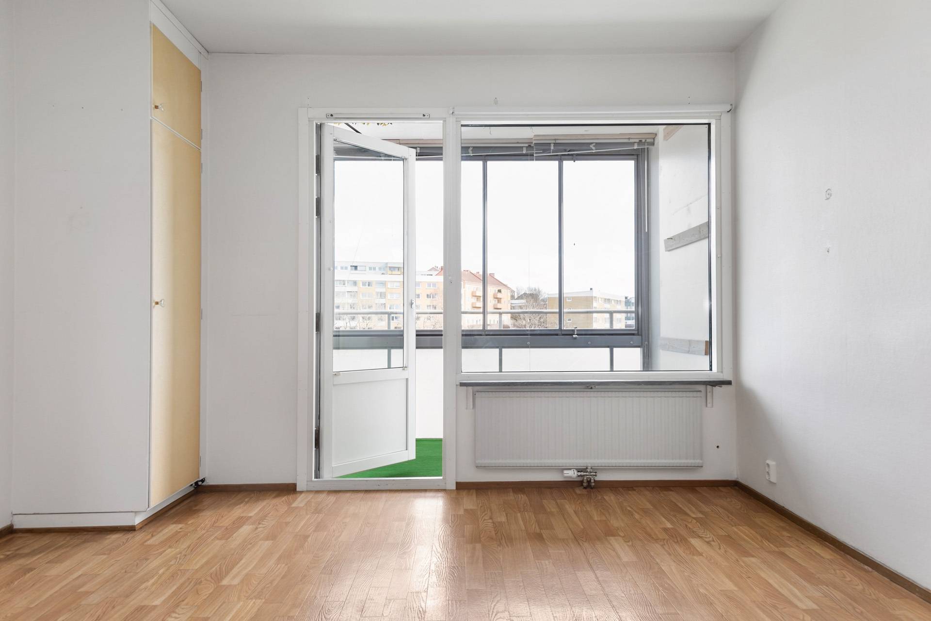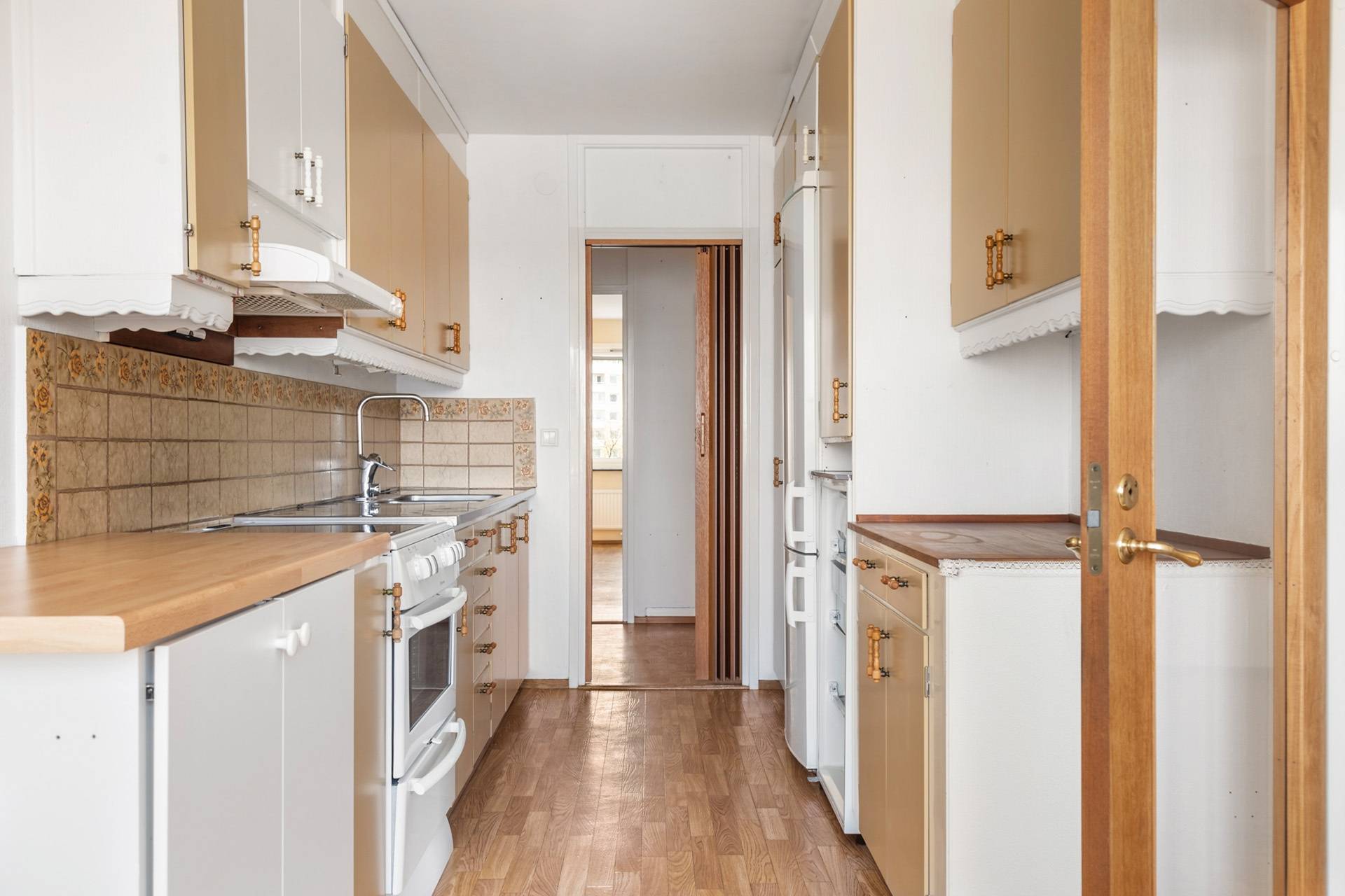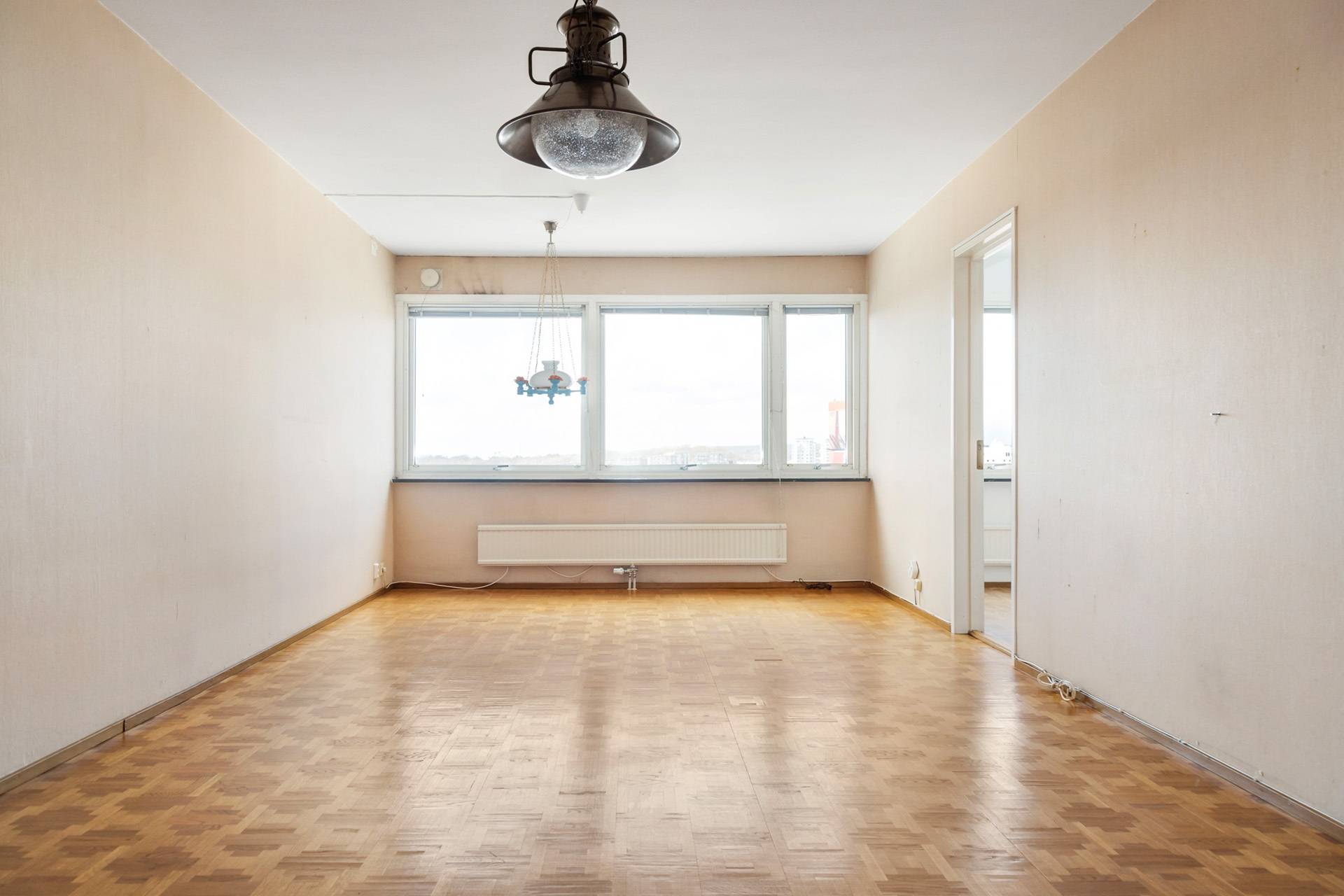 Det finns utsikter som förändrar hur man upplever ett hem. Från sjunde våningen på Gröna Gatan 65 öppnar sig ett panorama över Göta älv, Älvsborgsbron och Göteborgs hamninlopp – ett levande och skiftande landskap som förändras med ljuset, årstiderna och vädret. Det är en vy som är svår att lämna på morgonen och svår att glömma på kvällen, och den genomsyrar hela upplevelsen av att bo här. Lägenheten rymmer tre välproportionerade rum med en planlösning som sitter rätt. Vardagsrummet är generöst tilltaget och rymmer bekvämt en stor soffgrupp och matplats med god marginal – ett rum som trivs med folk och som fungerar lika bra för en stilla hemmakväll som för att ta emot gäster. Köket är välproportionerat med en separat matplats, en naturlig samlingsplats för frukost och familjemiddag, och med goda förutsättningar för den som vill uppgradera till ett kök efter eget tycke. Det stora sovrummet har en direktkoppling till det som är en av lägenhetens mest karaktärsfulla kvaliteter: den inglasade balkongen om ca 6 kvm. Det är ett uterum som faktiskt går att använda under större delen av året – för morgonkaffet i mars, en bok en blåsig hösteftermiddag, eller som en stilla observationspost under sommarkvällarna. Inglasningen gör balkongen till ett eget rum, ett mellanting mellan inne och ute som snabbt blir svårt att klara sig utan. Det andra sovrummet är rymligt och välformat med plats för dubbelsäng och tillhörande möblemang. Entrén är rymlig och välkomnande med goda förvaringsmöjligheter, och en separat klädkammare inne i bostaden löser ytterligare förvaring utan att inkräkta på de boendes rum. Badrummet är helrenoverat av föreningen i samband med stambytet 2018/2019 – med vita kakelplattor på väggar, beige/gult golvkakel, vit kommod med riklig förvaring och vägghängd toalett. Badrummet är även förberett med el, vatten och avlopp för att sätta in en tvättmaskin. Klart att flytta in i, och ett tryggt fundament inför den renovering av resten av lägenheten som väntar den nye ägaren. Interiören i övrigt bär en tydlig och ärlig 70-talsprägel. Det är en canvas snarare än ett färdigt hem – och sällan erbjuder marknaden möjligheten att renovera fritt i ett läge av den här kalibern, i en förening med det här underhållsläget, med den här utsikten inkluderad från dag ett. Hissen – faktiskt två stycken, en större och en mindre – gör att läget på sjunde våningen är en tillgång utan avkall.31 images