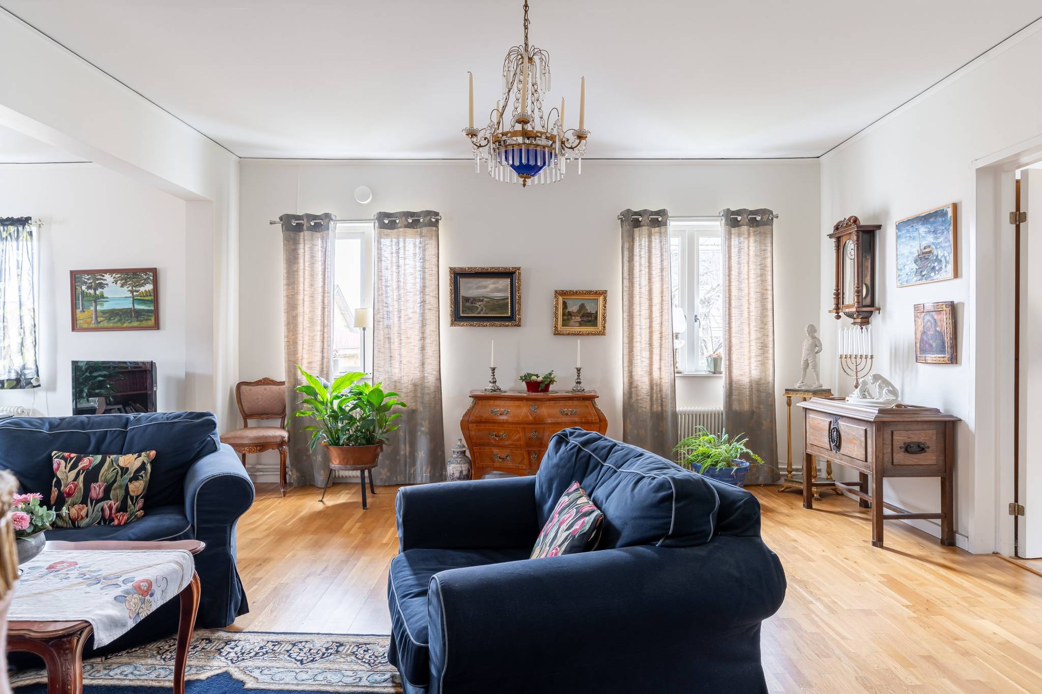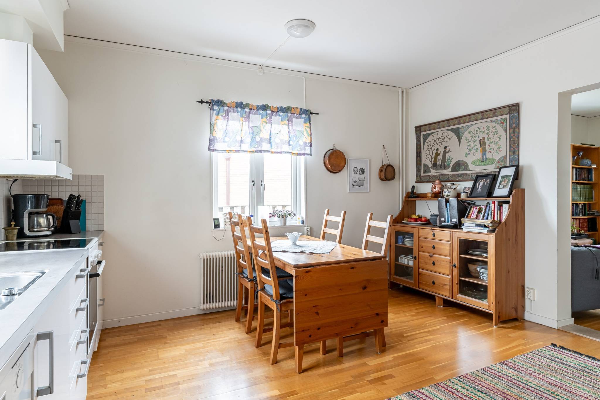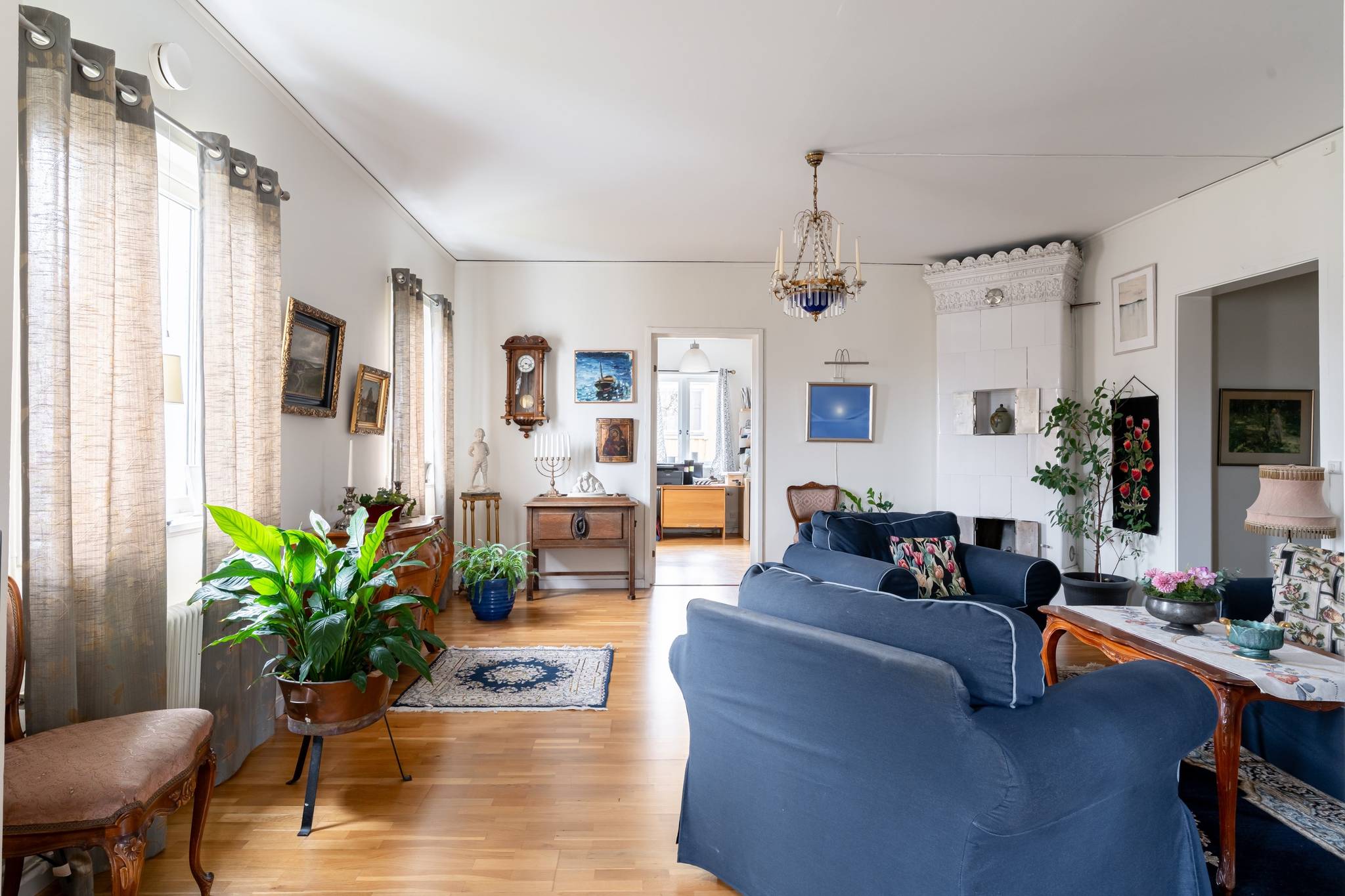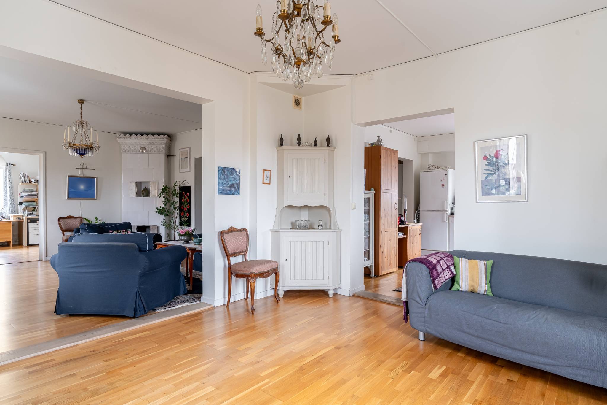 Välkommen till denna generösa och välplanerade fyrarumslägenhet i en trivsam och familjär förening! Här erbjuds hela 110 kvadratmeter fördelade över 4 rum och kök, med genomgående fina ytskikt i form av ekparkett och ljusa väggar. Bostadens hjärta utgörs av de stora, luftiga sällskapsytorna där den vackra kakelugnen skapar både karaktär och en inbjudande atmosfär. Det hemtrevliga köket är fullt utrustat och erbjuder dessutom gott om plats för ett matbord intill fönstret. Vardagsrum och matsal/salong ligger i fil och bjuder på en härlig rymd tack vare den generösa takhöjden samt stora fönsterpartier som släpper in rikligt med ljus. Lägenheten erbjuder två fräscha, helkaklade badrum – båda utrustade med dusch, varav det ena även har en praktisk tvättpelare. Bostaden erbjuder två stycken sovrum samt även en separat klädkammare. För ytterligare förvaring finns ett stort vindsförråd. Här bor du med ett bekvämt läge, endast några meter från välsorterad matbutik, apotek, restauranger och frisör. Inom kort gångavstånd finns även grundskola (F–9), fina grönområden samt goda bussförbindelser. Ett charmigt och bekvämt boende med det lilla extra – varmt välkommen på visning!17 images