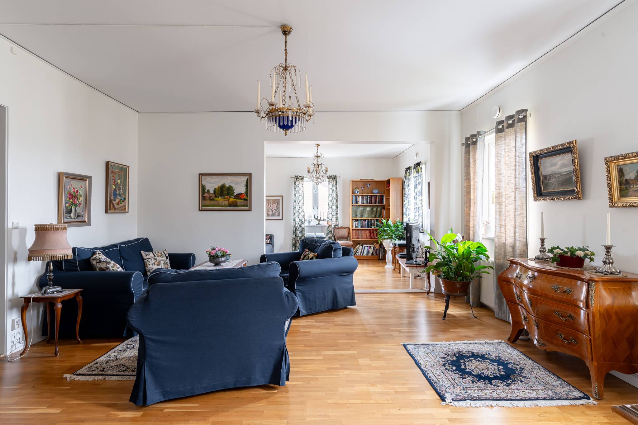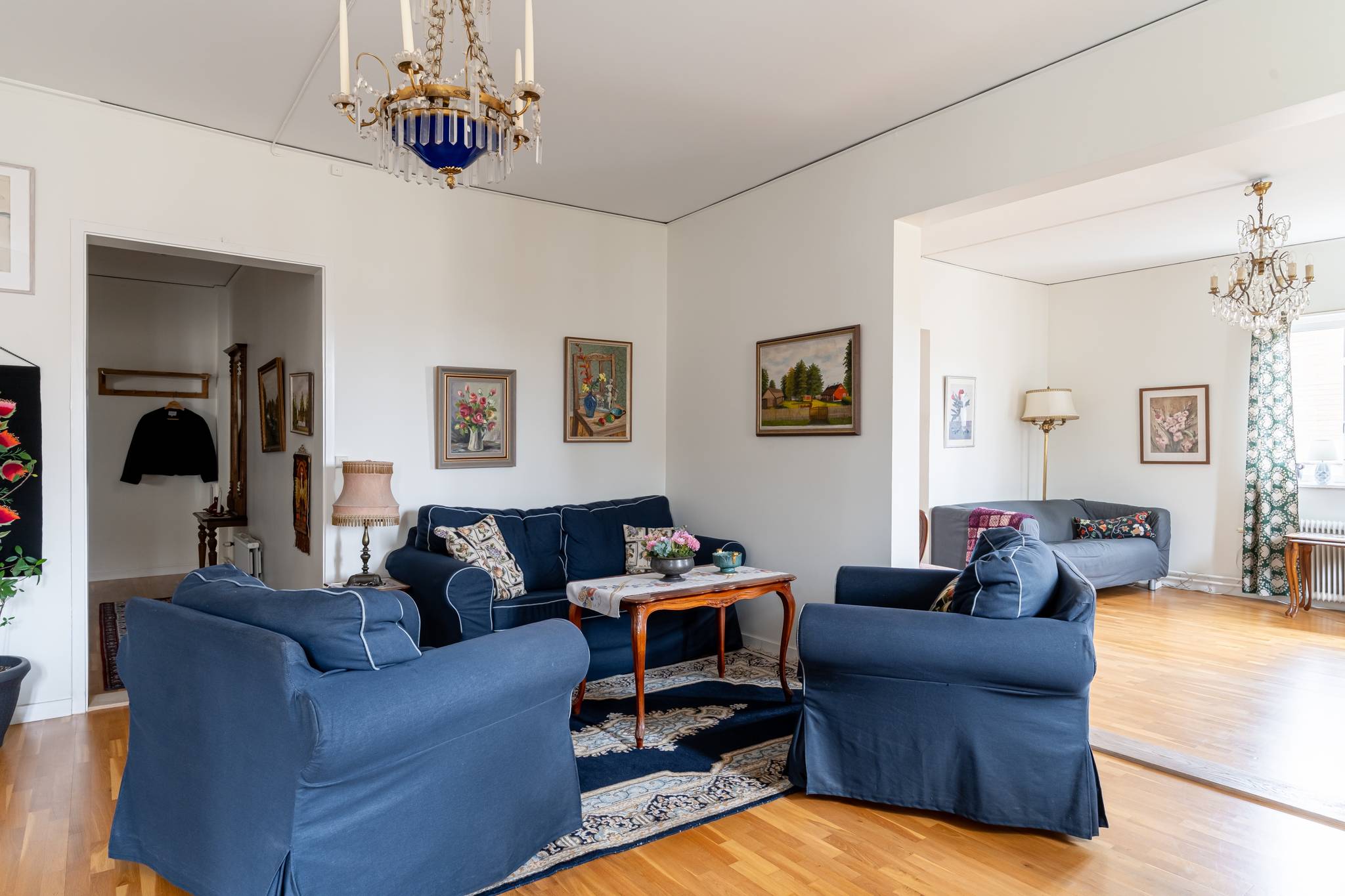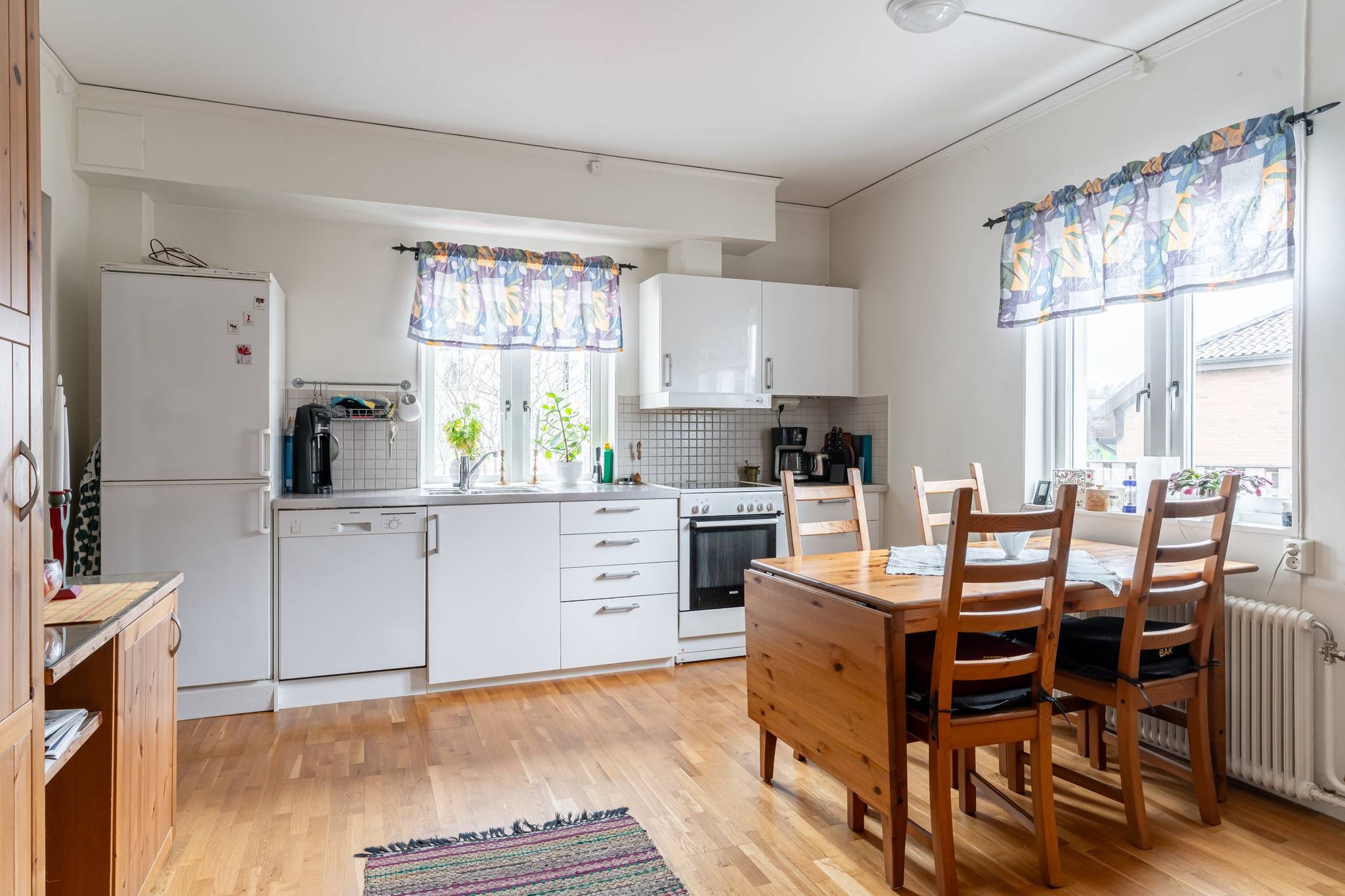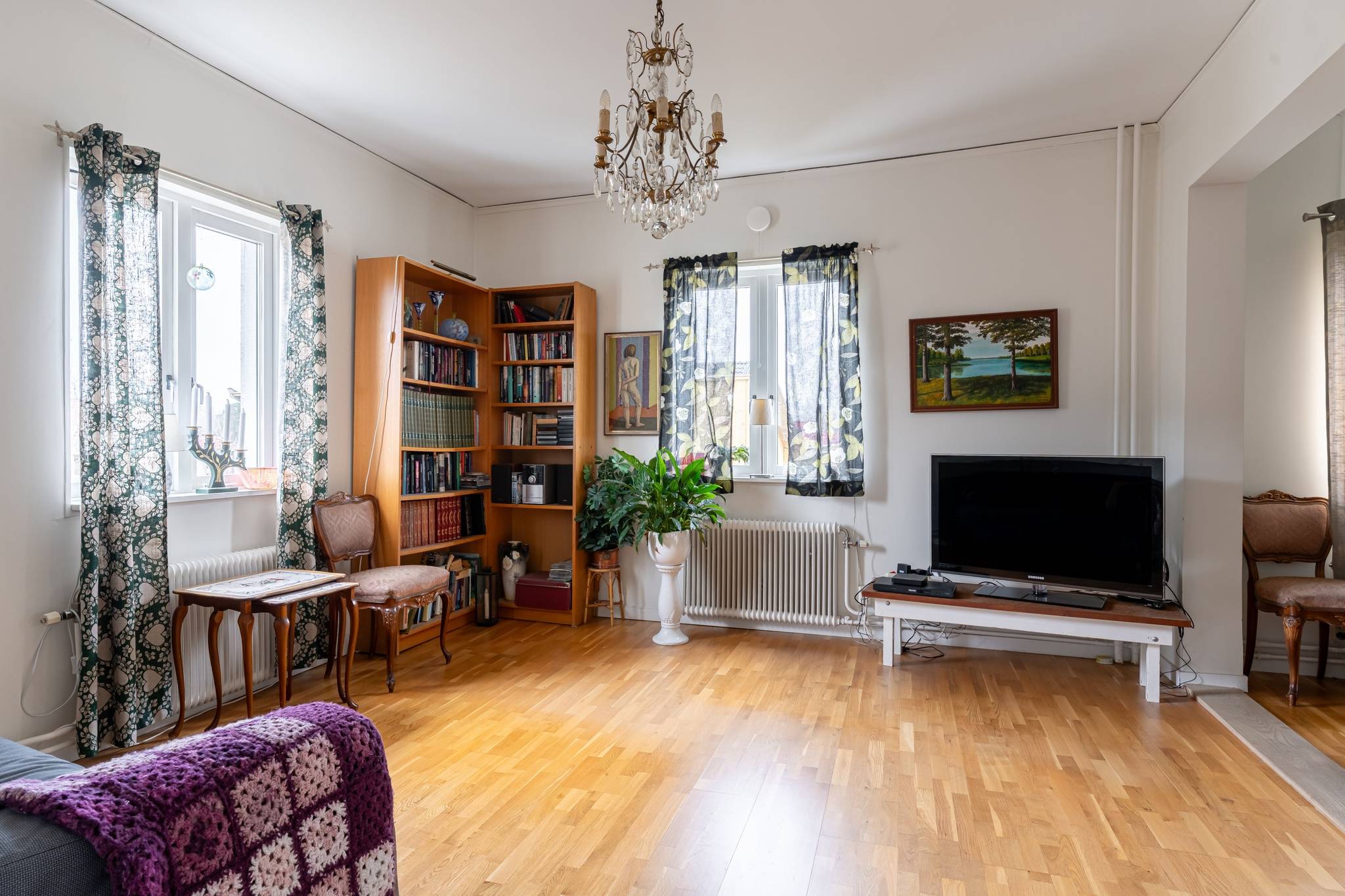 Välkommen till denna generösa och välplanerade fyrarumslägenhet i en trivsam och familjär förening! Här erbjuds hela 110 kvadratmeter fördelade över 4 rum och kök, med genomgående fina ytskikt i form av ekparkett och ljusa väggar. Bostadens hjärta utgörs av de stora, luftiga sällskapsytorna där den vackra kakelugnen skapar både karaktär och en inbjudande atmosfär. Det hemtrevliga köket är fullt utrustat och erbjuder dessutom gott om plats för ett matbord intill fönstret. Vardagsrum och matsal/salong ligger i fil och bjuder på en härlig rymd tack vare den generösa takhöjden samt stora fönsterpartier som släpper in rikligt med ljus. Lägenheten erbjuder två fräscha, helkaklade badrum – båda utrustade med dusch, varav det ena även har en praktisk tvättpelare. Bostaden erbjuder två stycken sovrum samt även en separat klädkammare. För ytterligare förvaring finns ett stort vindsförråd. Här bor du med ett bekvämt läge, endast några meter från välsorterad matbutik, apotek, restauranger och frisör. Inom kort gångavstånd finns även grundskola (F–9), fina grönområden samt goda bussförbindelser. Ett charmigt och bekvämt boende med det lilla extra – varmt välkommen på visning!17 images