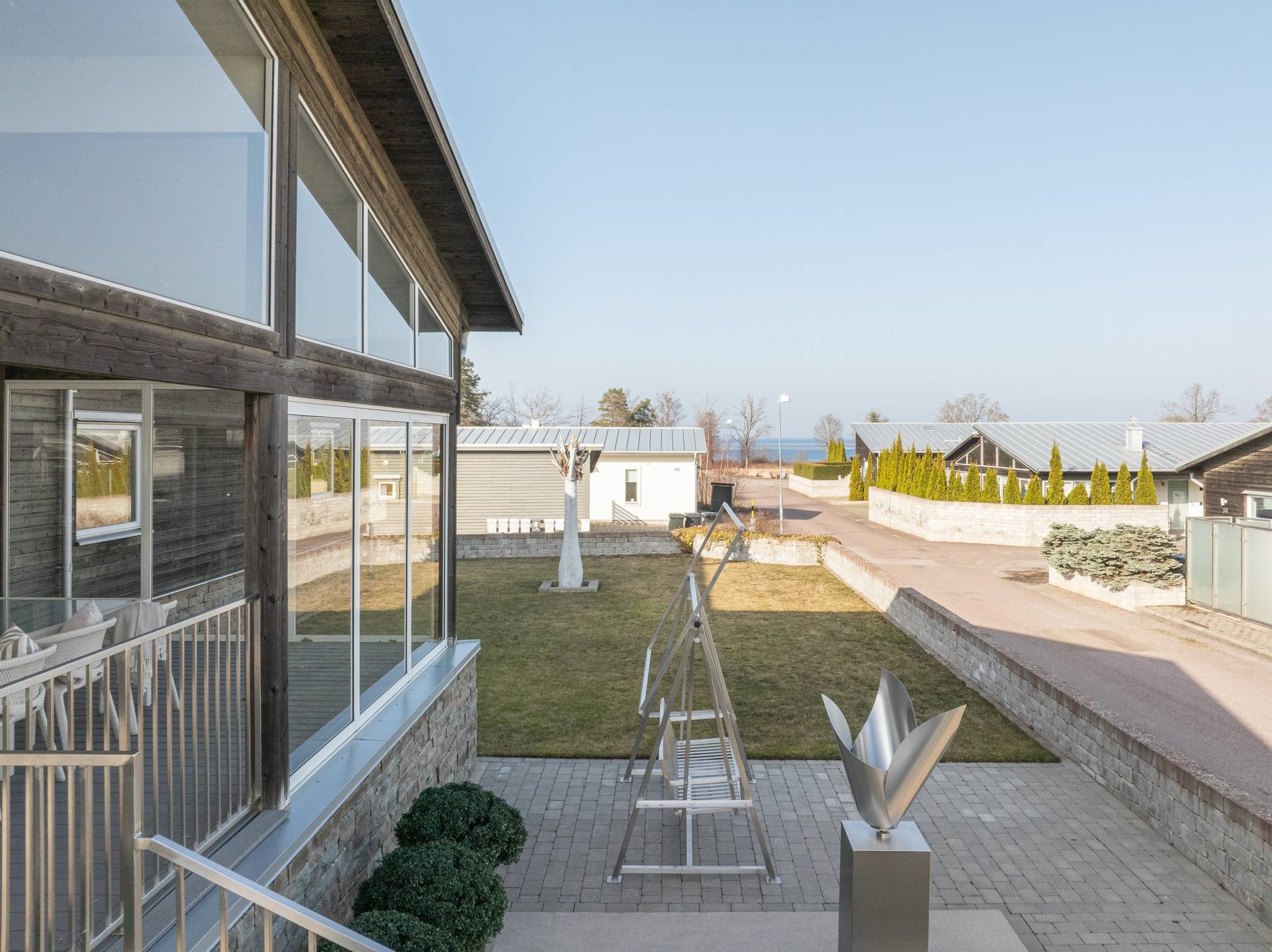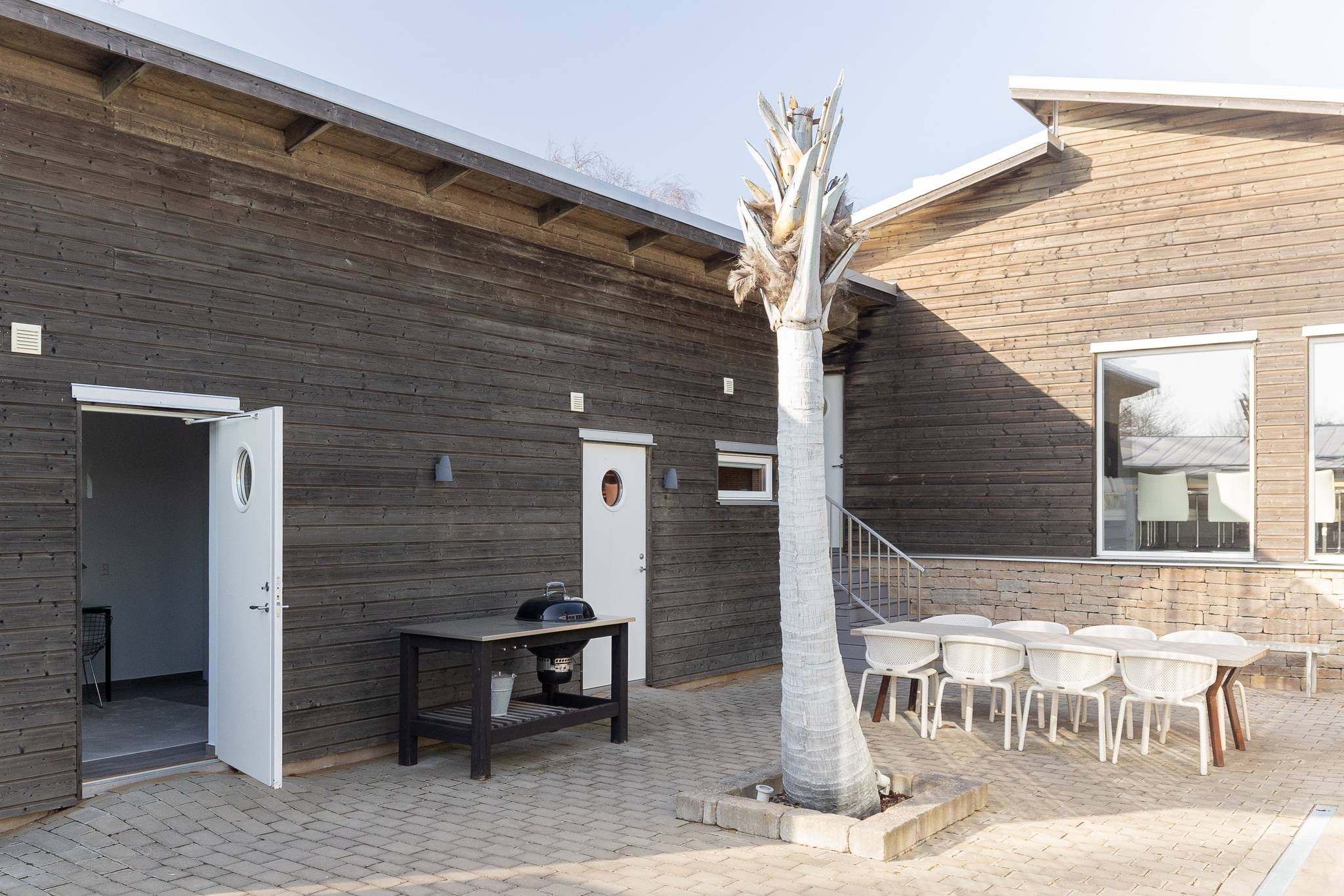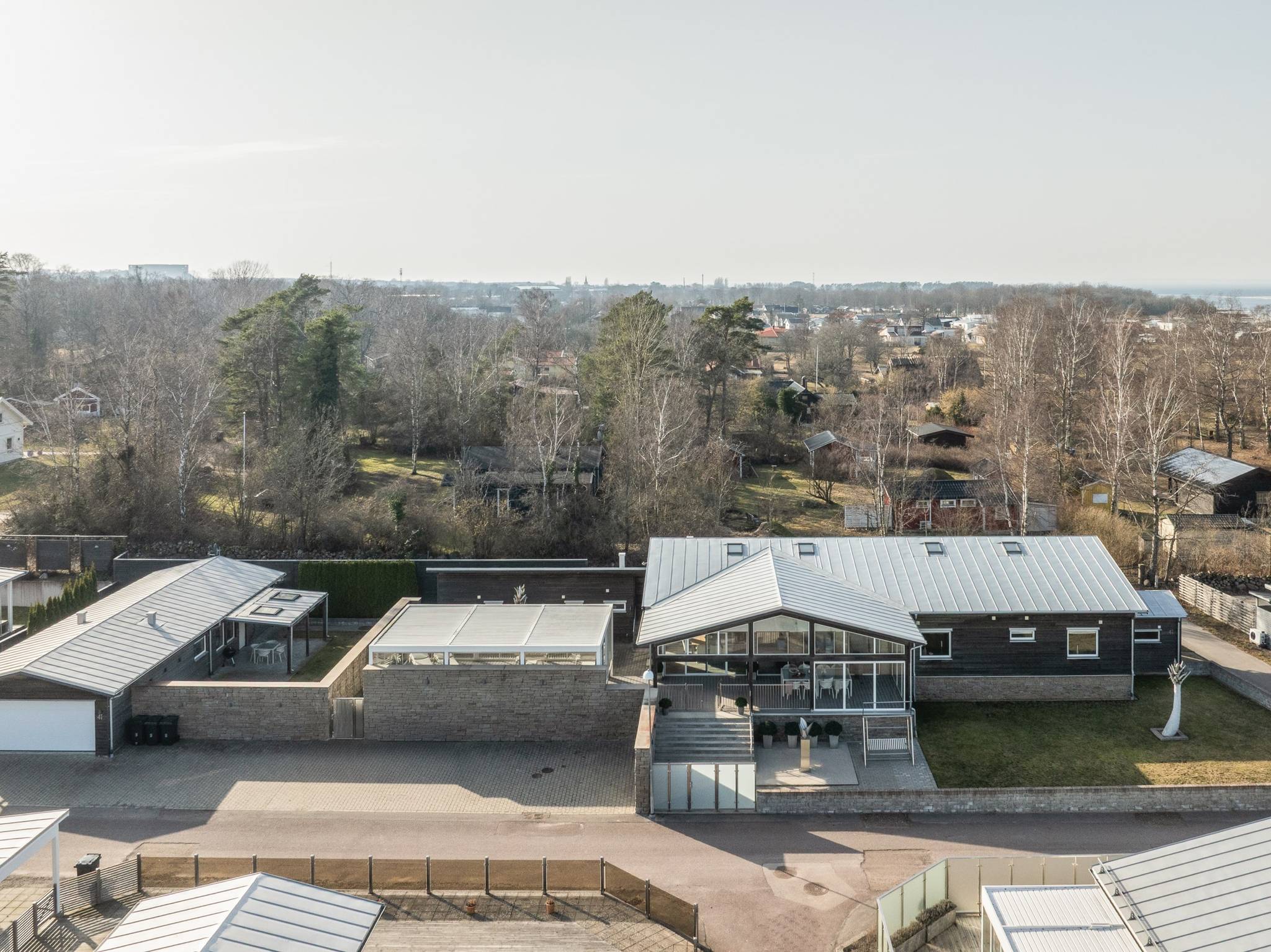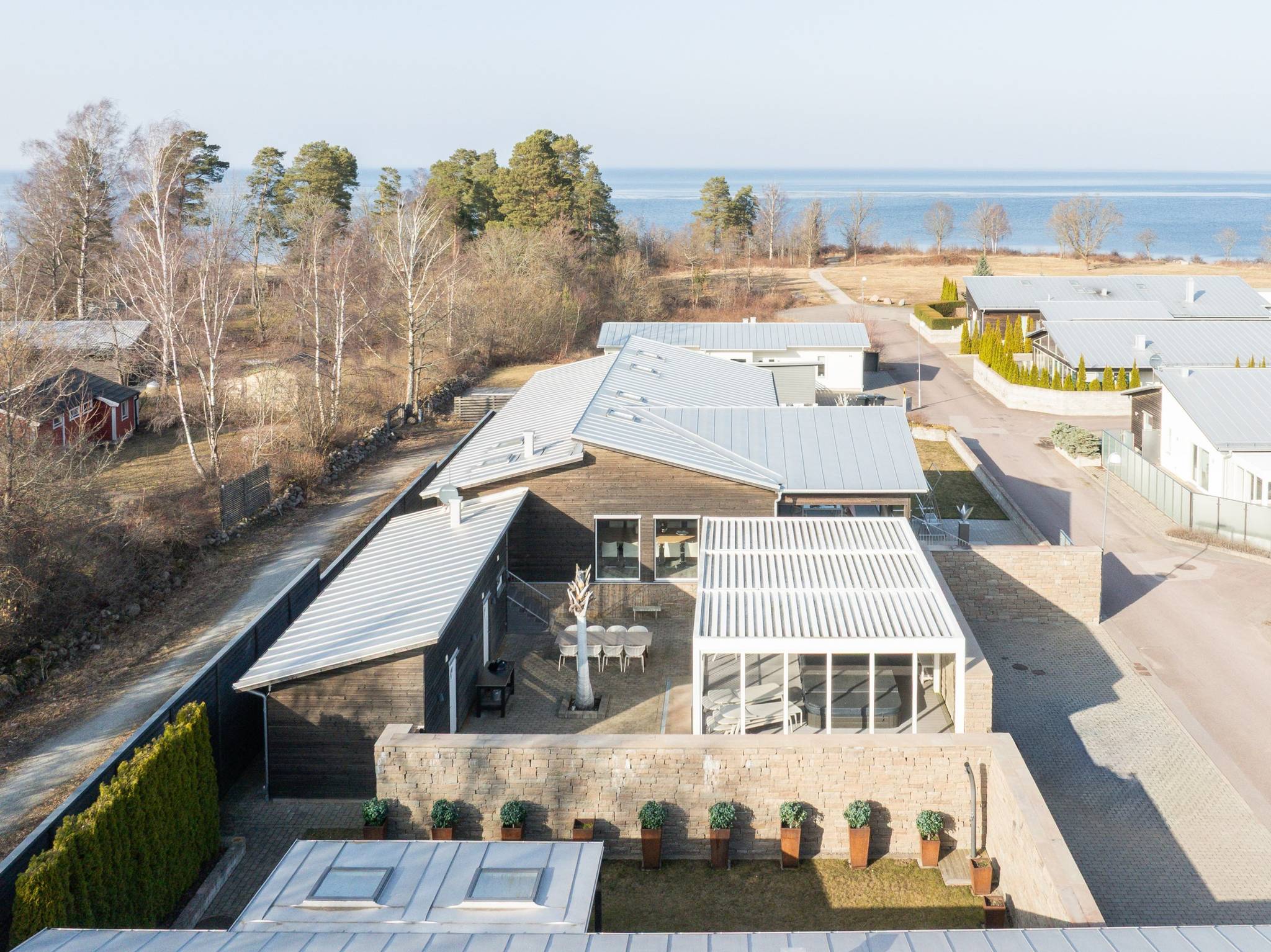 På fyra sammanlagda fastigheter i eftertraktade Björkviken har ett hem vuxit fram som närmast kan beskrivas som ett eget litet kvarter. Här breder cirka 440 kvadratmeter byggnader ut sig – med ett generöst bostadshus om cirka 235 kvm kompletterat av gästhus om cirka 60 kvm samt ytterligare omkring 140 kvm biarea i form av bastuhus, gästrum och ett stort dubbelgarage. Arkitekturen är självsäker och genomtänkt där material och proportioner knyter an till Ölands landskap. Murar av öländsk kalksten delar upp tomten i olika rum och skapar en utemiljö med både struktur och integritet – något som ger platsen en nästan medelhavslik karaktär. I bostadshuset möts man av generösa sällskapsytor där ljuset strömmar in genom stora glaspartier och ger en luftig och öppen känsla genom rummen. Här finns fyra sovrum – samtliga med egna badrum en suite – samt en separat gästtoalett, vilket gör huset lika väl anpassat för familjeliv som för större middagar och besök av gäster. Från den stora uteplatsen, med gott om plats för ett generöst matbord, öppnar sig vyerna över Kalmarsund där kvällssolen dröjer sig kvar över vattnet. Här kan middagarna gärna bli långa medan ljuset sakta sjunker bakom horisonten. Den mekaniska pergolan skapar en flexibel utemiljö och intill väntar ett stort swimspa som förlänger badsäsongen långt in på året. Fastigheten erbjuder även ett stort dubbelgarage samt uppställningsplats för ytterligare flera bilar – praktiskt när huset fylls av familj och vänner. Helheten ger känslan av ett privat retreat där både arkitektur och omgivning samspelar. Björkviken, strax utanför Borgholm, tillhör några av Ölands mest eftertraktade områden. Här möts öppna landskap, havets närvaro och den speciella stillhet som gjort ön så älskad i generationer. Naturen är ständigt närvarande – med kuststräckor, vandringsleder och cykelvägar som bjuder in till morgonpromenader och kvällsturer i solnedgången. Läget är dessutom idealiskt placerat mellan Borgholm och Köpingsvik. På några minuter når du Borgholms restauranger och caféer där gourmetmat och stadsliv möter sommarkvällarnas puls, samtidigt som Köpingsvik erbjuder några av Ölands mest uppskattade badstränder och en levande kvällsstämning under sommaren. Samtidigt ligger allt detta på ett behagligt avstånd från hemmets lugn. Kombinationen av natur, hav, närhet till stadsliv och den generösa fastigheten gör detta till ett boende som är svårt att jämföra med något annat på Öland.57 images