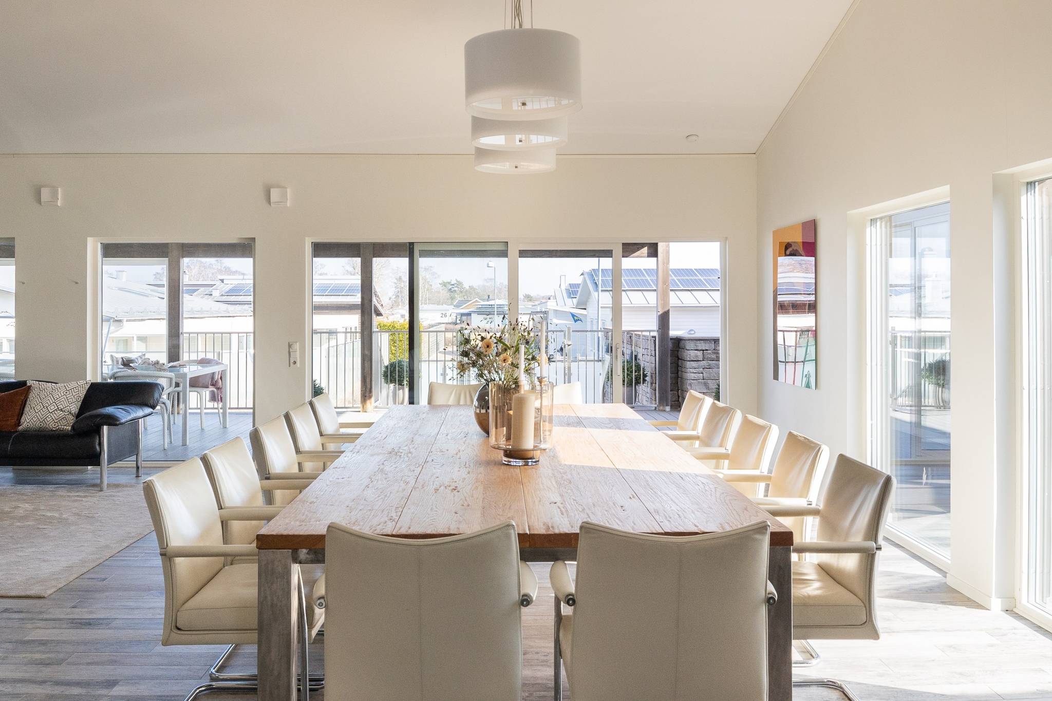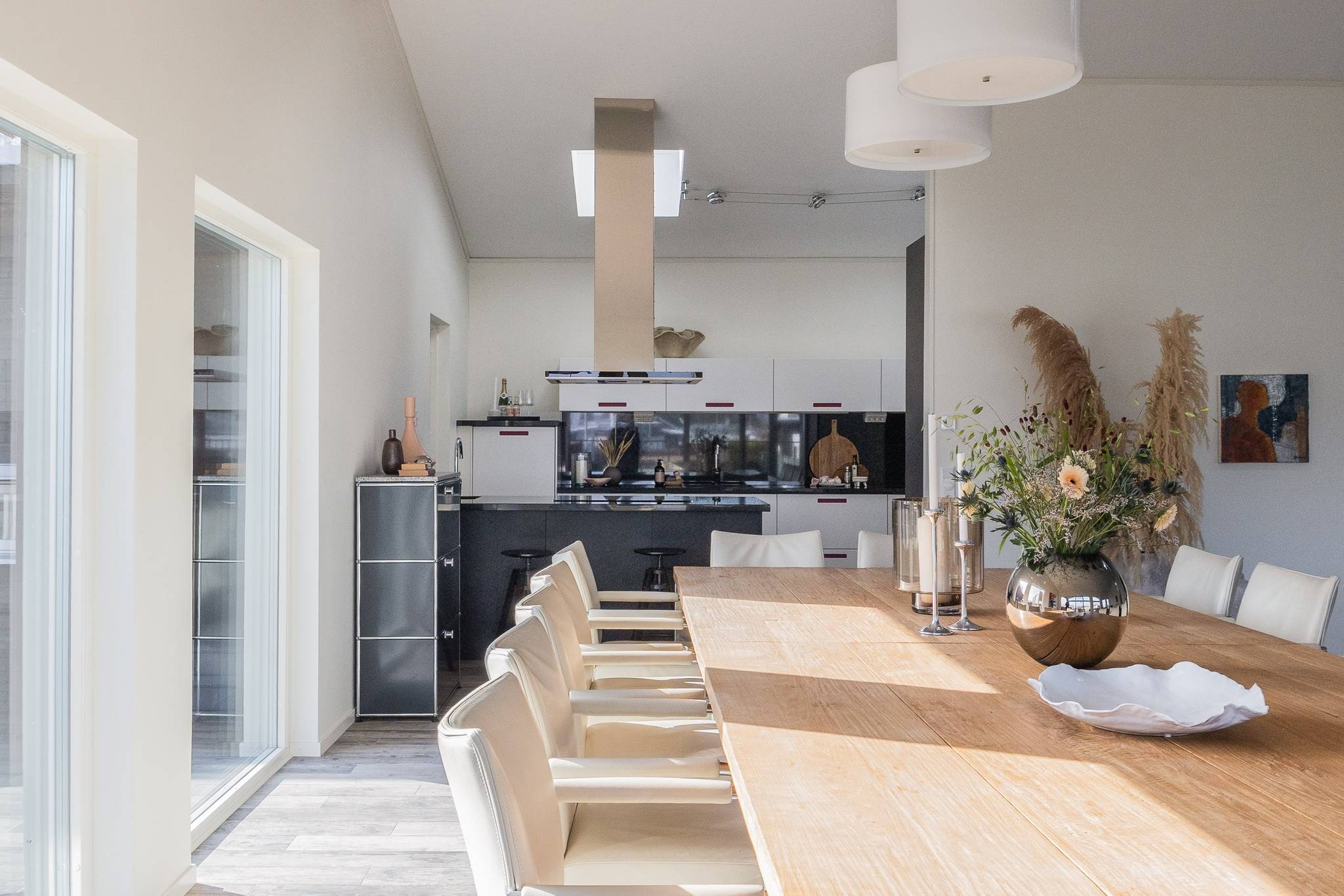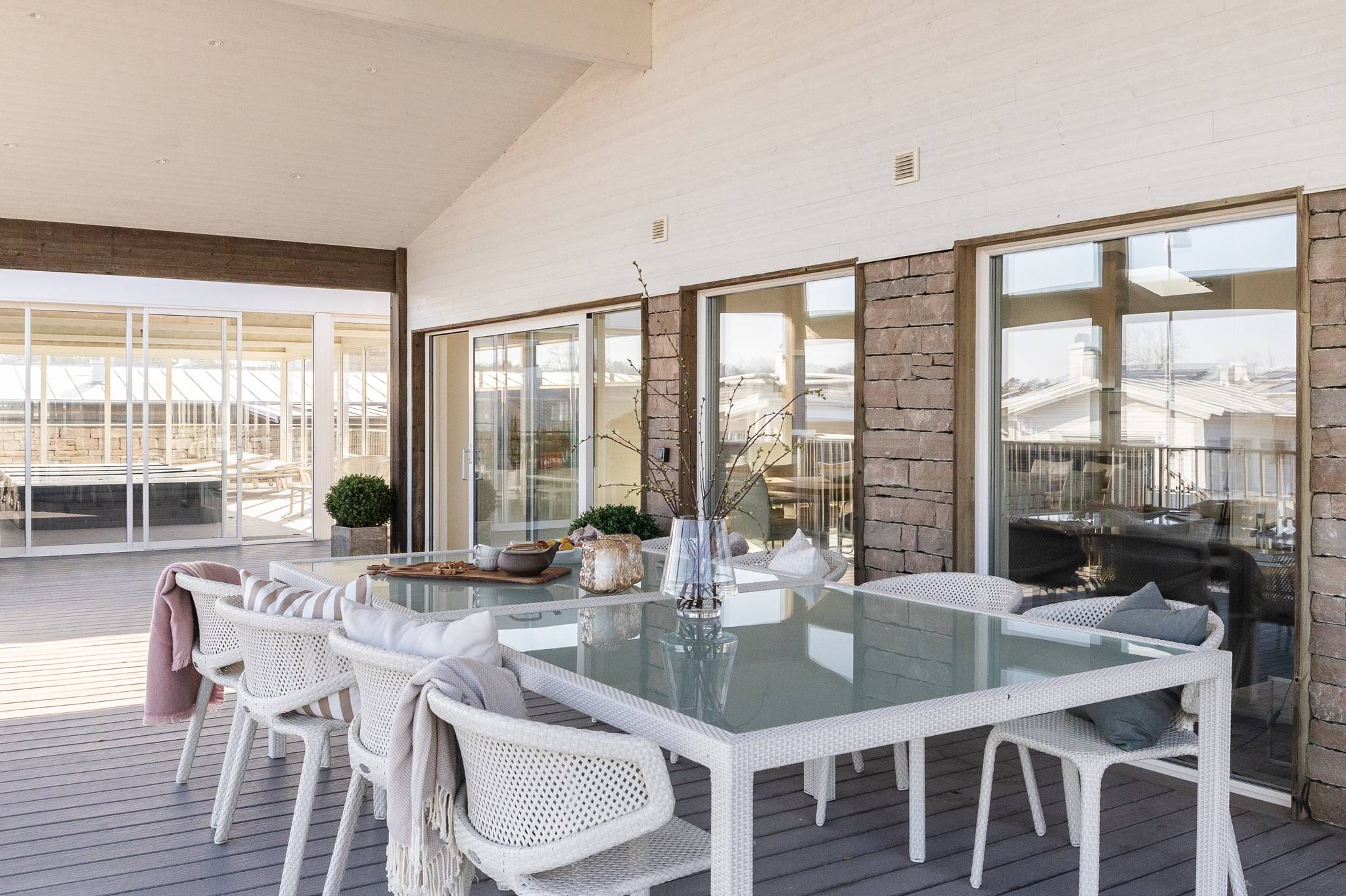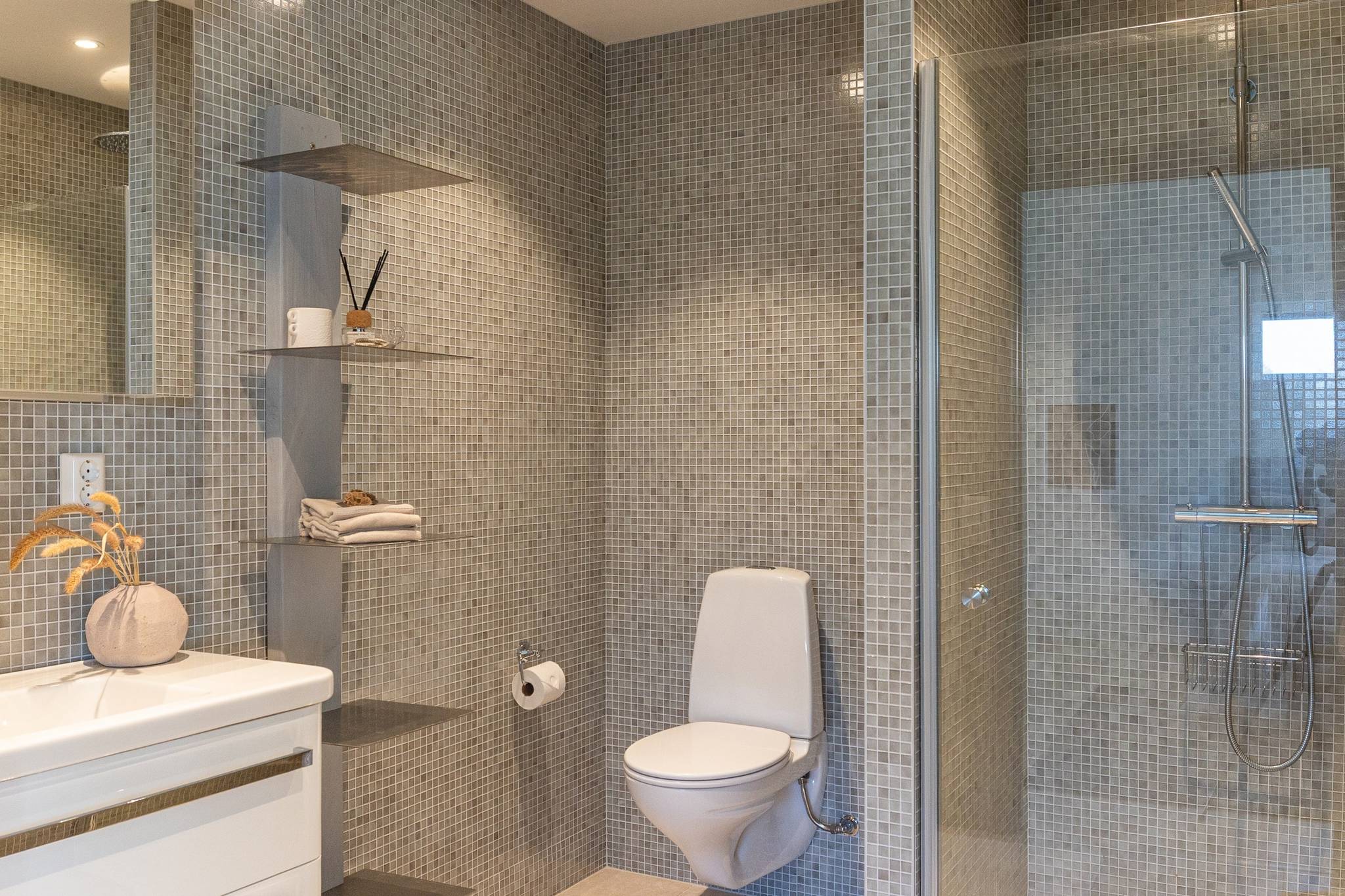 På fyra sammanlagda fastigheter i eftertraktade Björkviken har ett hem vuxit fram som närmast kan beskrivas som ett eget litet kvarter. Här breder cirka 440 kvadratmeter byggnader ut sig – med ett generöst bostadshus om cirka 235 kvm kompletterat av gästhus om cirka 60 kvm samt ytterligare omkring 140 kvm biarea i form av bastuhus, gästrum och ett stort dubbelgarage. Arkitekturen är självsäker och genomtänkt där material och proportioner knyter an till Ölands landskap. Murar av öländsk kalksten delar upp tomten i olika rum och skapar en utemiljö med både struktur och integritet – något som ger platsen en nästan medelhavslik karaktär. I bostadshuset möts man av generösa sällskapsytor där ljuset strömmar in genom stora glaspartier och ger en luftig och öppen känsla genom rummen. Här finns fyra sovrum – samtliga med egna badrum en suite – samt en separat gästtoalett, vilket gör huset lika väl anpassat för familjeliv som för större middagar och besök av gäster. Från den stora uteplatsen, med gott om plats för ett generöst matbord, öppnar sig vyerna över Kalmarsund där kvällssolen dröjer sig kvar över vattnet. Här kan middagarna gärna bli långa medan ljuset sakta sjunker bakom horisonten. Den mekaniska pergolan skapar en flexibel utemiljö och intill väntar ett stort swimspa som förlänger badsäsongen långt in på året. Fastigheten erbjuder även ett stort dubbelgarage samt uppställningsplats för ytterligare flera bilar – praktiskt när huset fylls av familj och vänner. Helheten ger känslan av ett privat retreat där både arkitektur och omgivning samspelar. Björkviken, strax utanför Borgholm, tillhör några av Ölands mest eftertraktade områden. Här möts öppna landskap, havets närvaro och den speciella stillhet som gjort ön så älskad i generationer. Naturen är ständigt närvarande – med kuststräckor, vandringsleder och cykelvägar som bjuder in till morgonpromenader och kvällsturer i solnedgången. Läget är dessutom idealiskt placerat mellan Borgholm och Köpingsvik. På några minuter når du Borgholms restauranger och caféer där gourmetmat och stadsliv möter sommarkvällarnas puls, samtidigt som Köpingsvik erbjuder några av Ölands mest uppskattade badstränder och en levande kvällsstämning under sommaren. Samtidigt ligger allt detta på ett behagligt avstånd från hemmets lugn. Kombinationen av natur, hav, närhet till stadsliv och den generösa fastigheten gör detta till ett boende som är svårt att jämföra med något annat på Öland.57 images